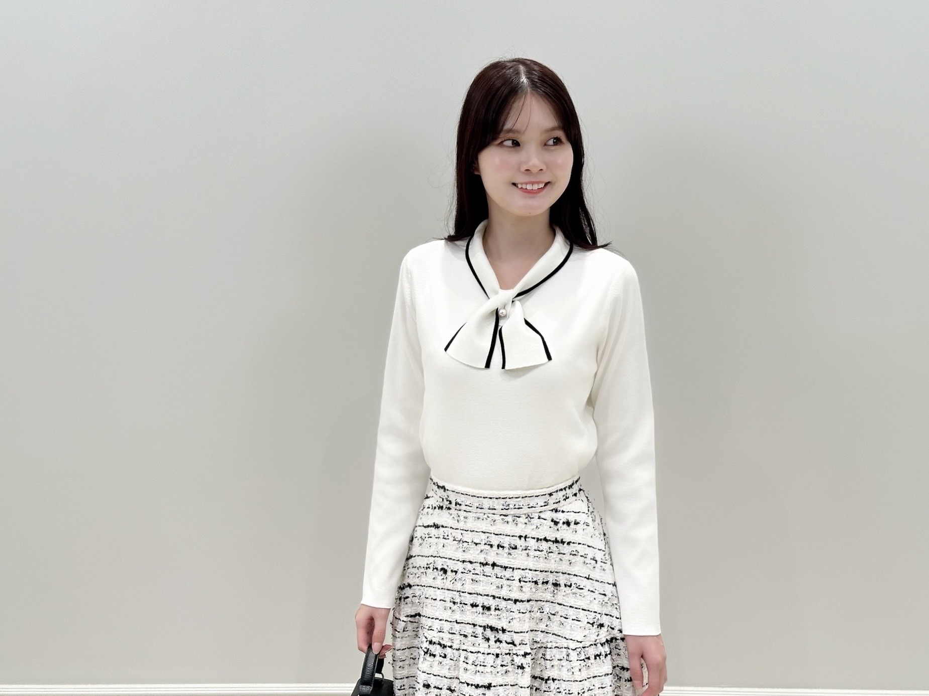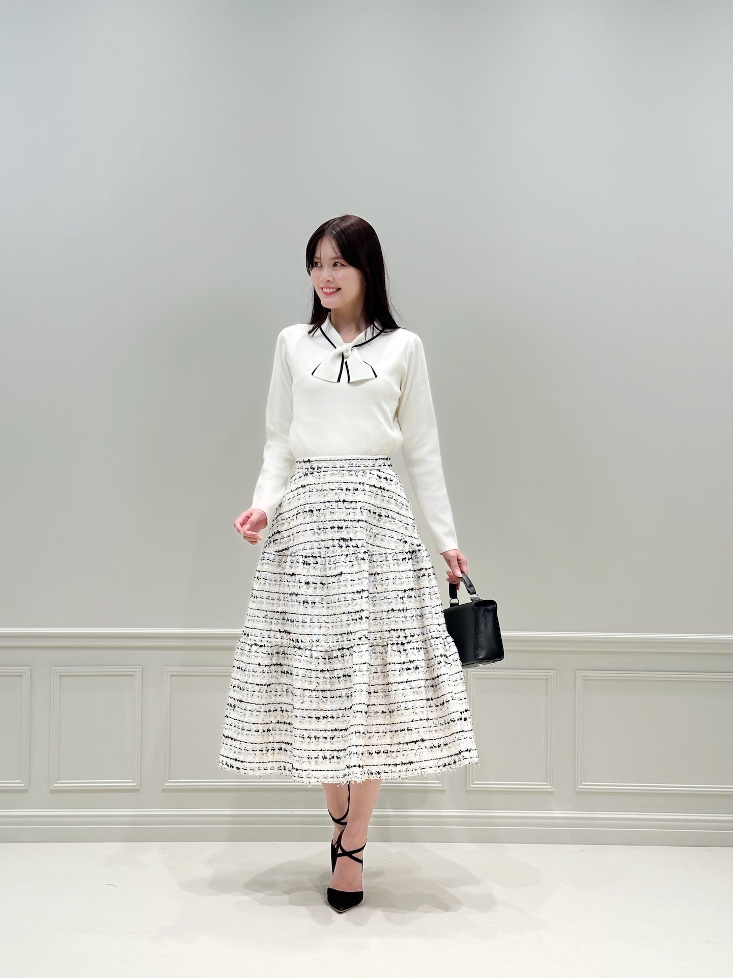 目を惹くバイカラーのボウタイリボンが上品で洗練された印象を与えてくれる一着。