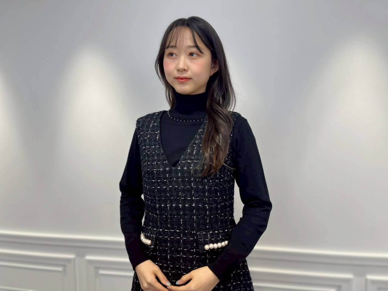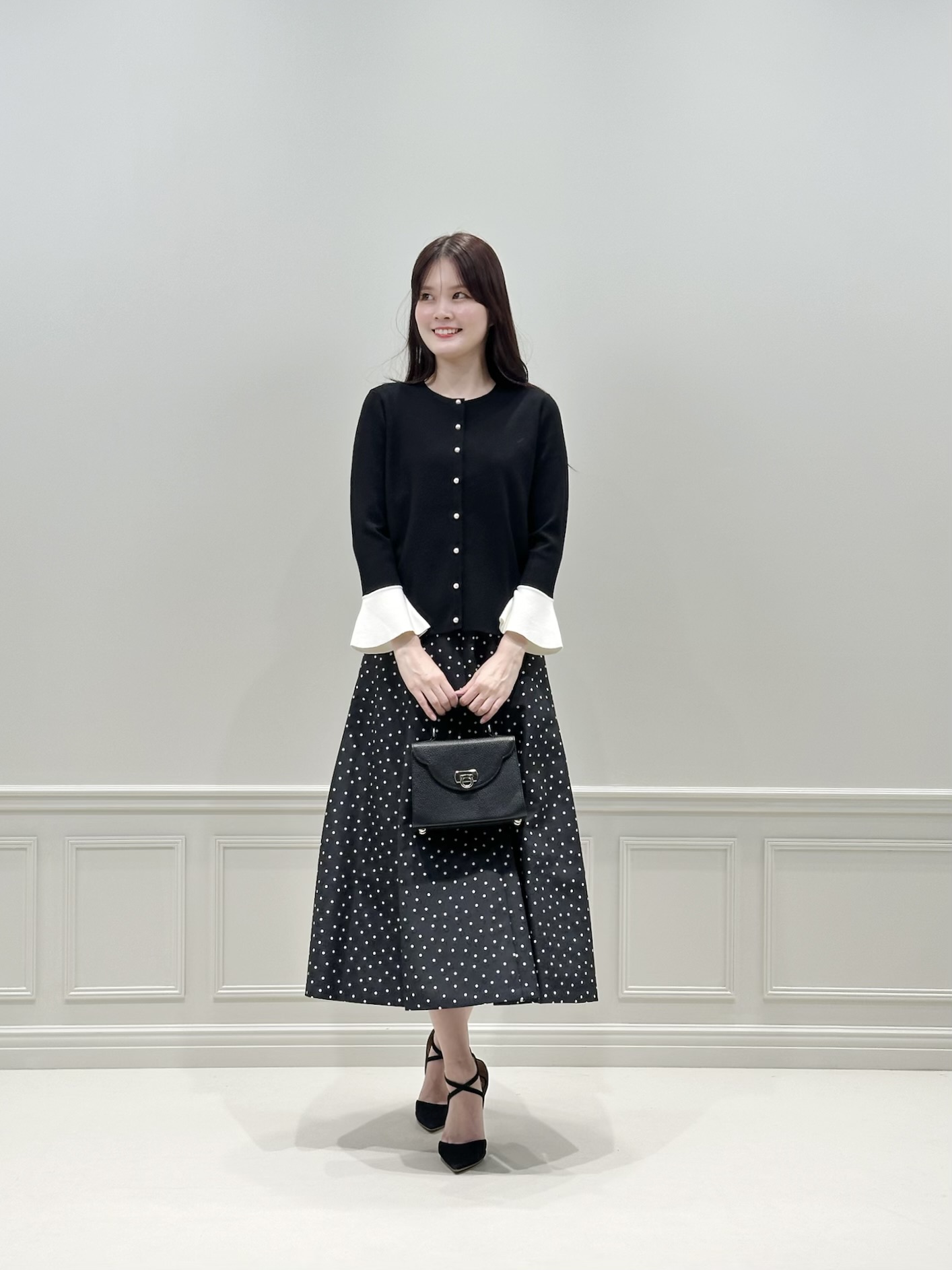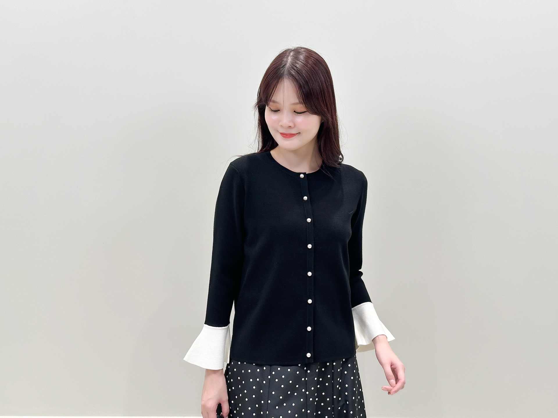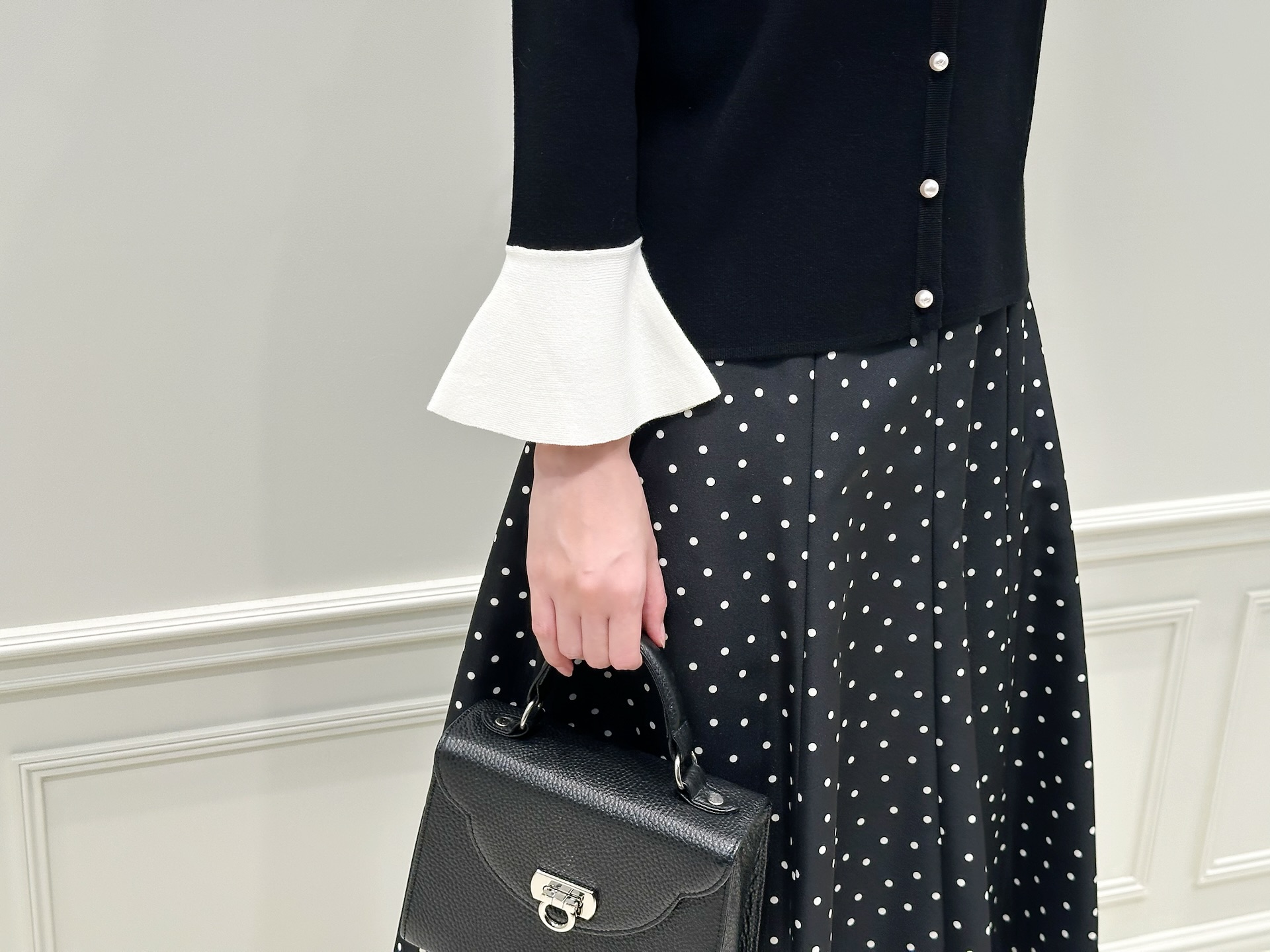 袖口は白の配色フレア切替で軽やかな動きを演出し、モノトーンの中に華やぎを添えました。