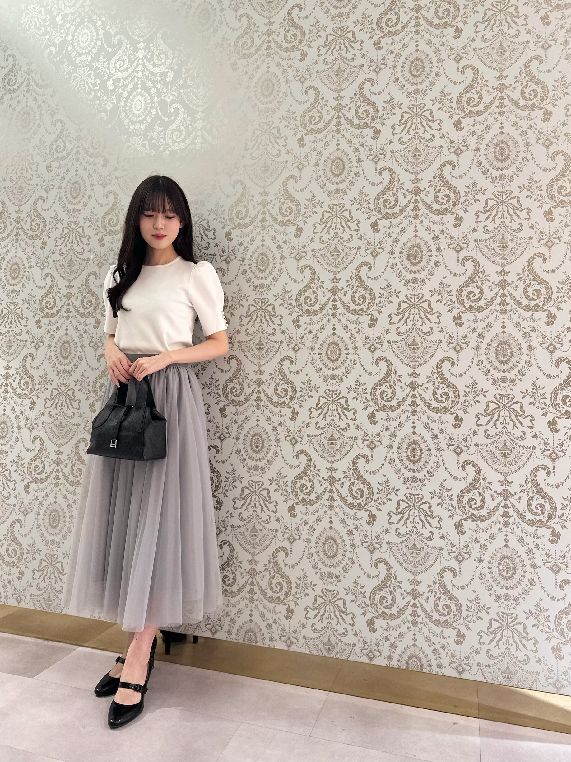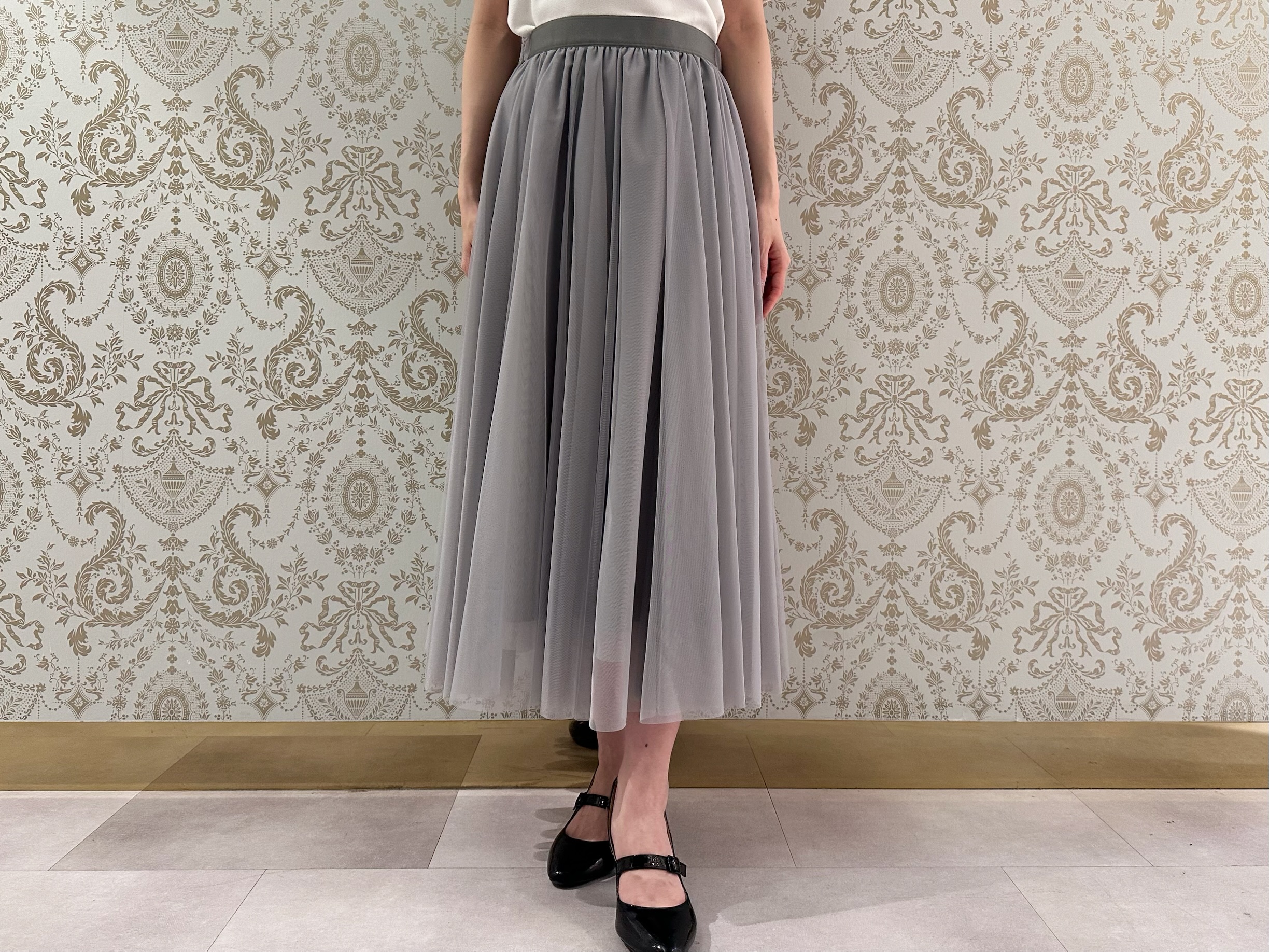 女性らしい華やかなコーディネートに導くチュール素材のスカート。