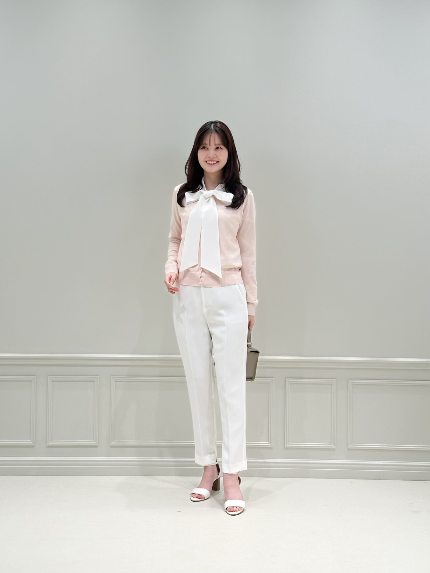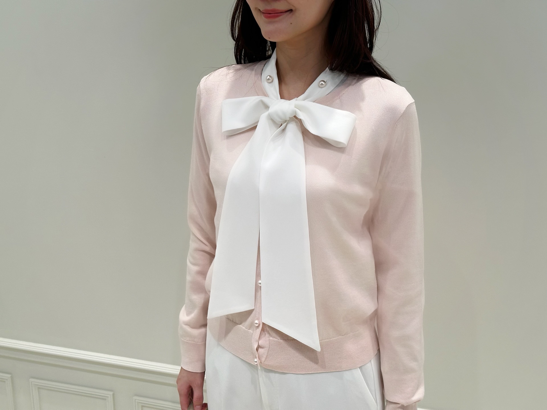 襟元に施されたパールボタンの輝きが目を惹くアクセントになったリボンタイデザイン。