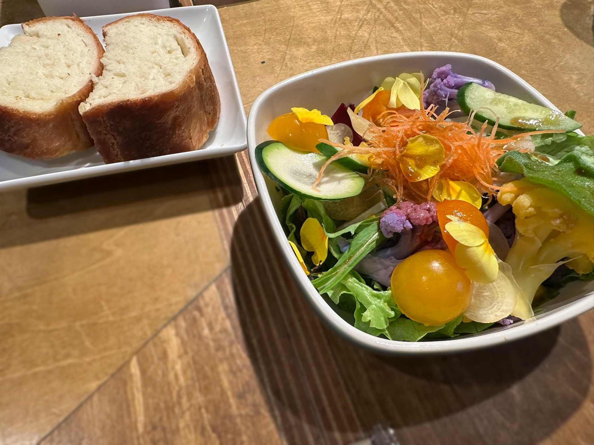 彩り豊かなサラダと焼き立てのパン、そしてしっかりと旨みを感じるメインのお魚料理。ほどよく贅沢で、でも気取らない、ちょうどいいバランスのランチタイムに。