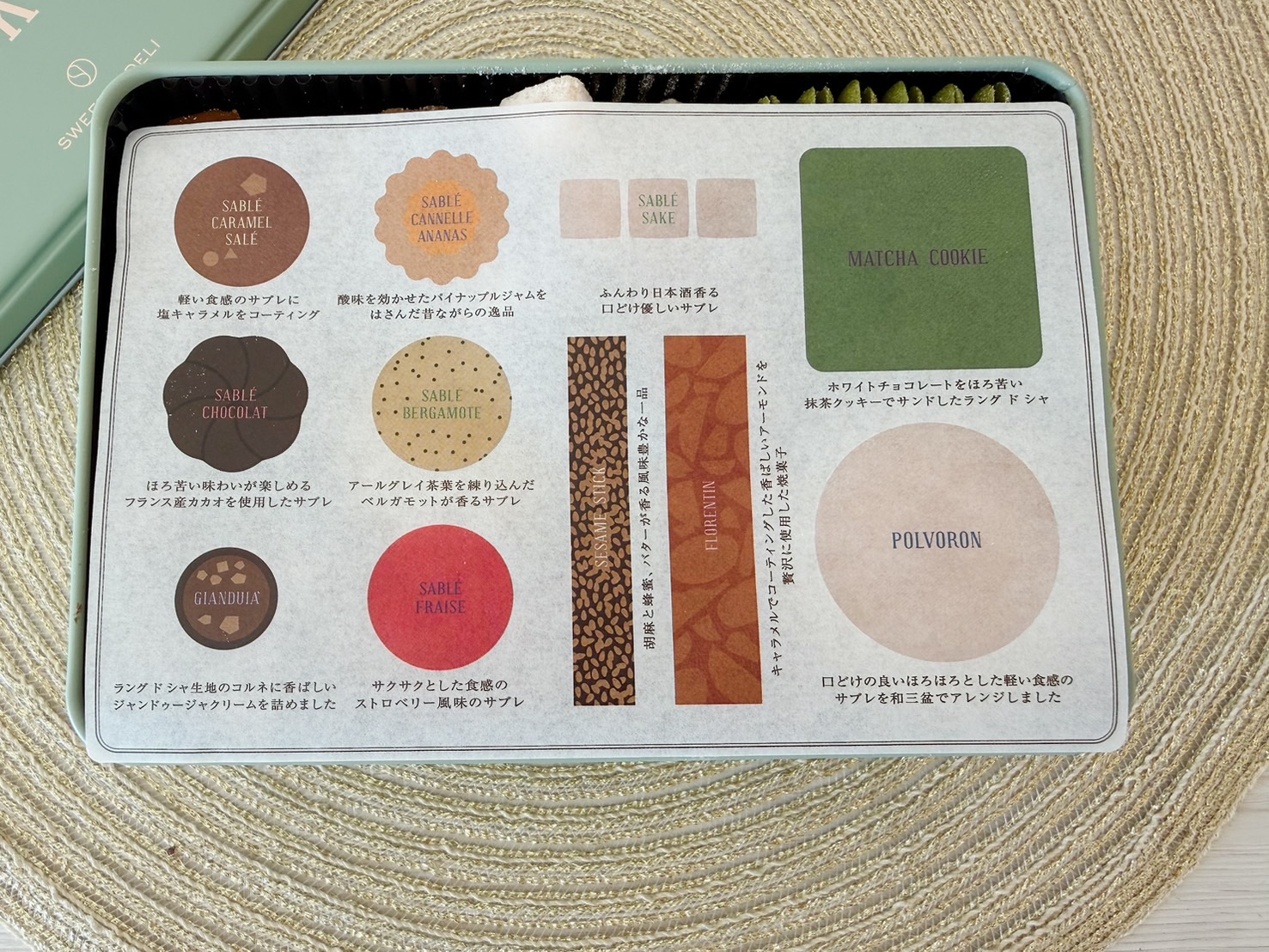 蓋を開けると、ぎっしりと詰められた色とりどりの焼き菓子。整然と並ぶ様子はまるで宝石箱のようで、ひとつひとつを眺める時間も楽しみのひとつです。