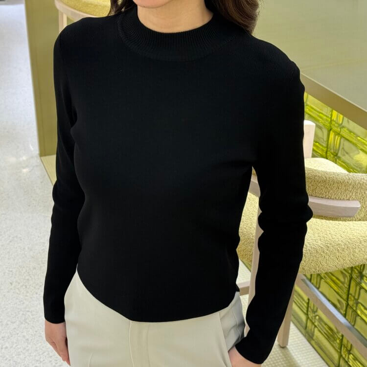 ハイネックのバック部分に施されたさりげないスリットと、前後差のある着丈が今年らしさを存分に愉しめます♪