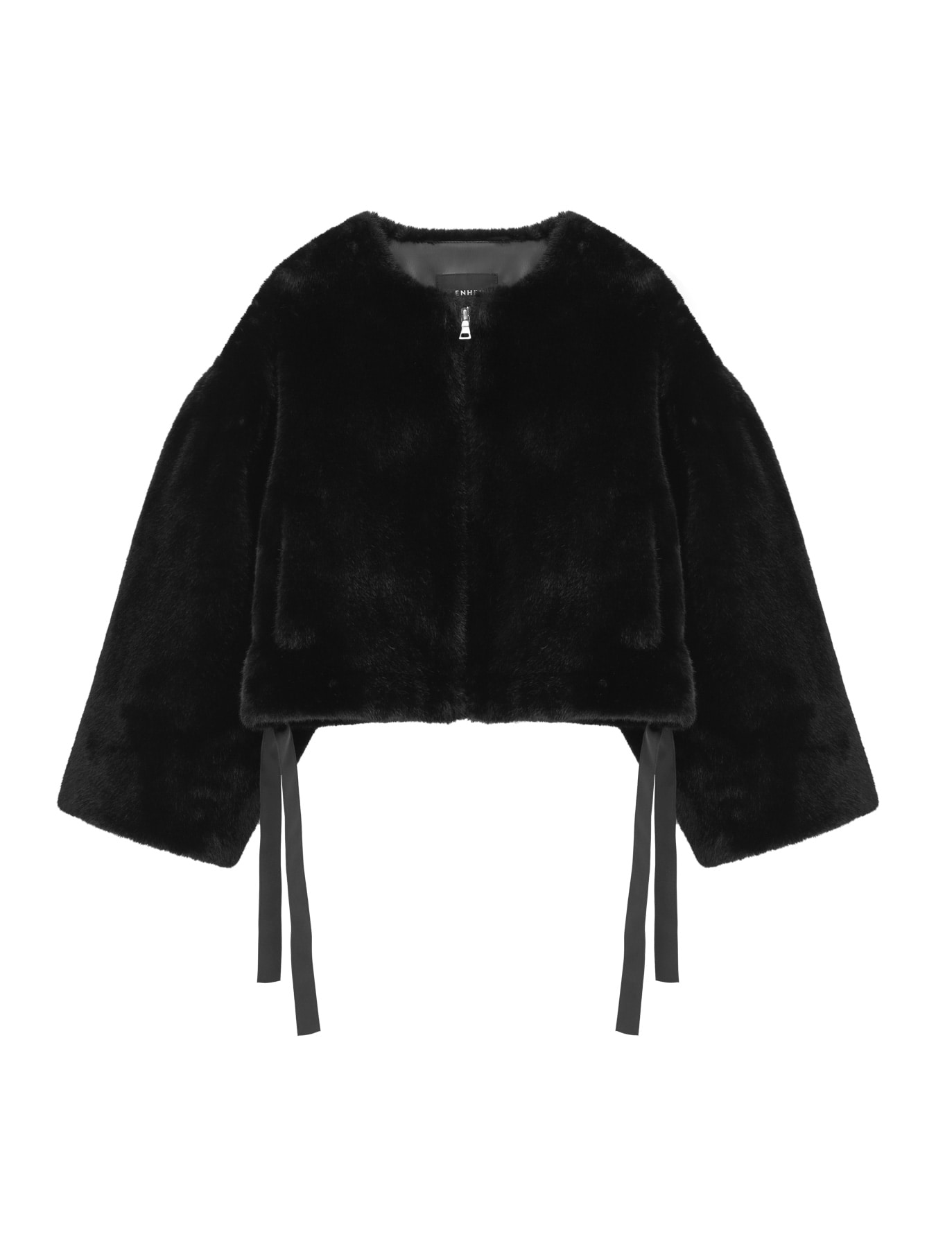 艶やかなフェイクファーの質感が、エレガントでありながらもモードな印象を与えるショートコート。