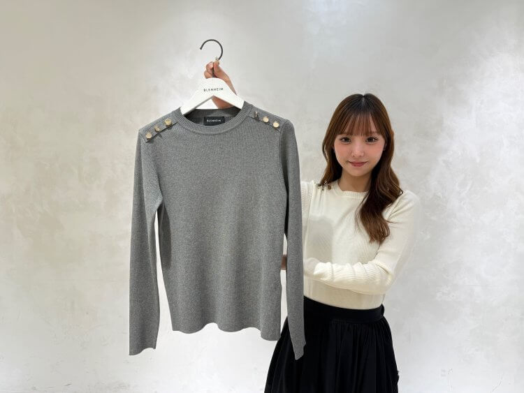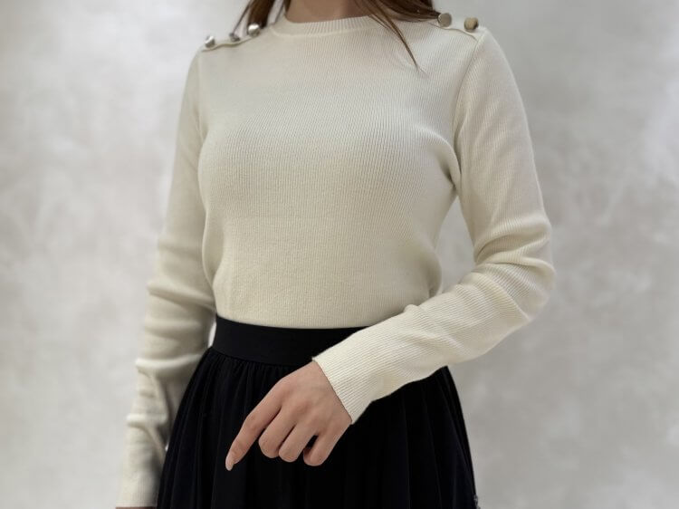 肩のメタルボタンがさりげないアクセントになったリブニットは、女性らしいシルエットを引き立てる一枚。