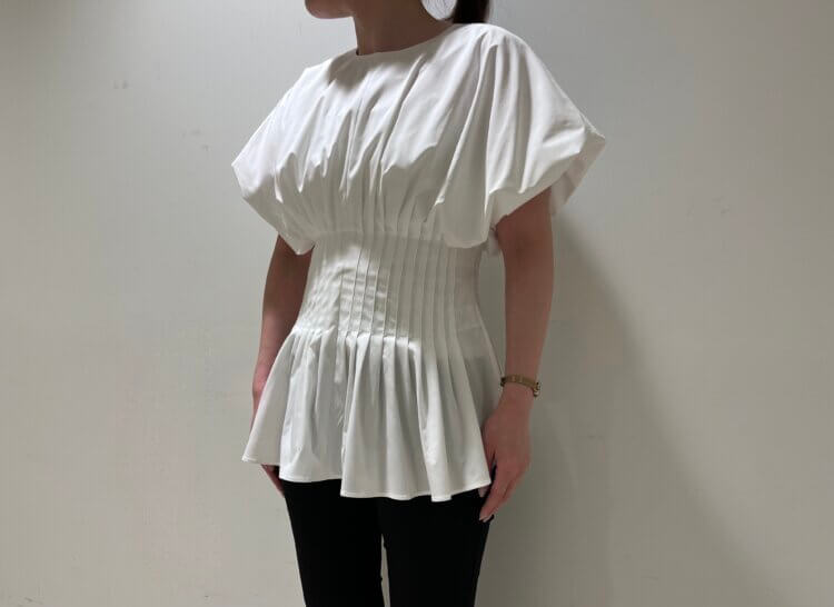ウエスト部分に施されたタックが一目引くデザインブラウス。