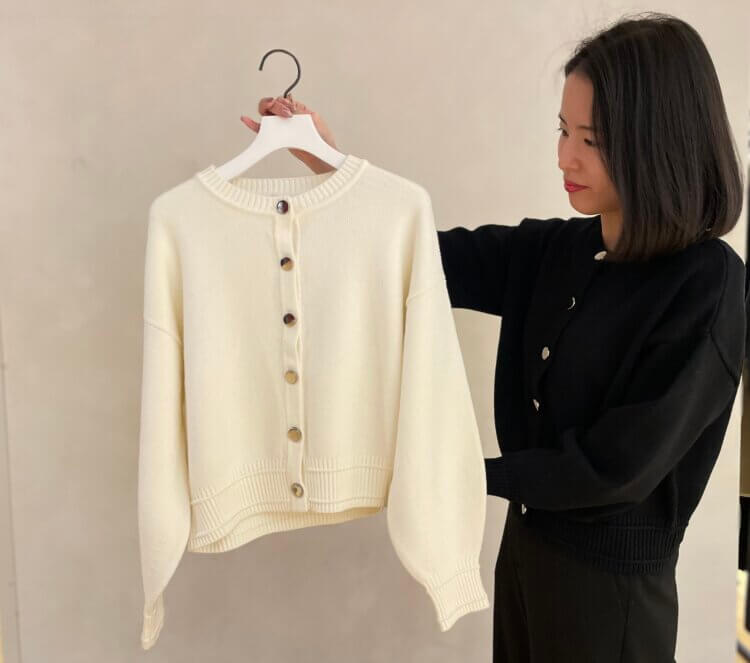 柔らかなアイボリーで顔映りも良く、ボタンデザインが上品なアクセントに。