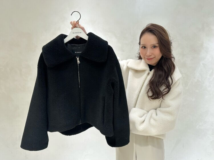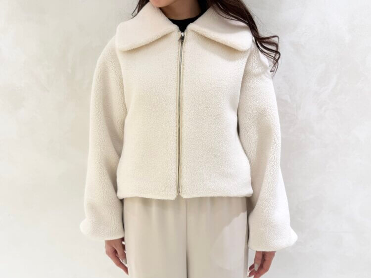 ふんわり柔らかなボア素材が、羽織るだけでシーズンムードを高めてくれるショートコート。