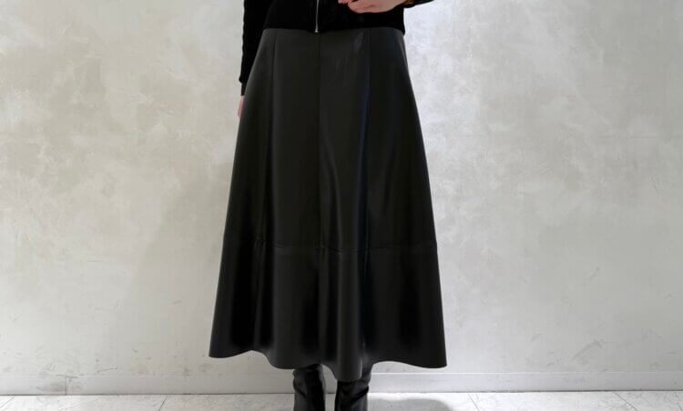 程よいツヤ感が魅力のフェイクレザーフレアスカート。