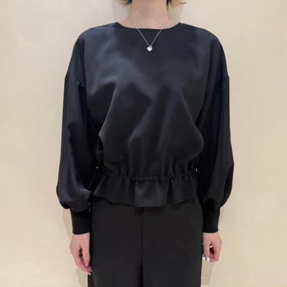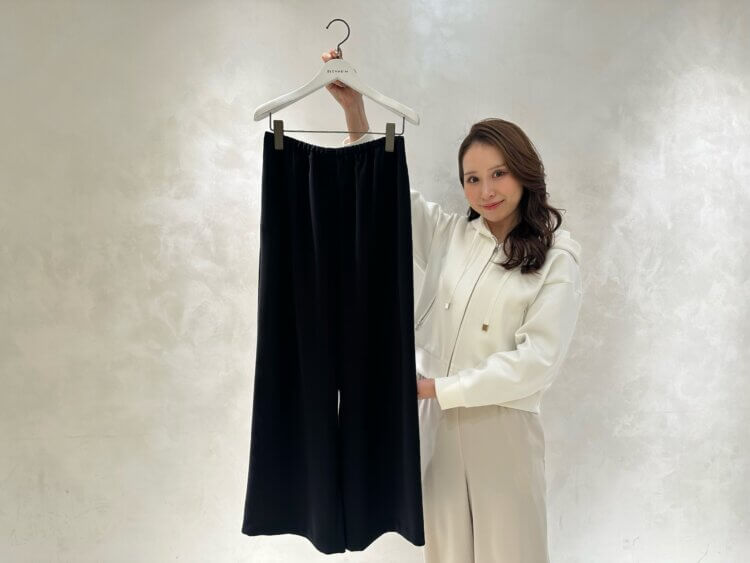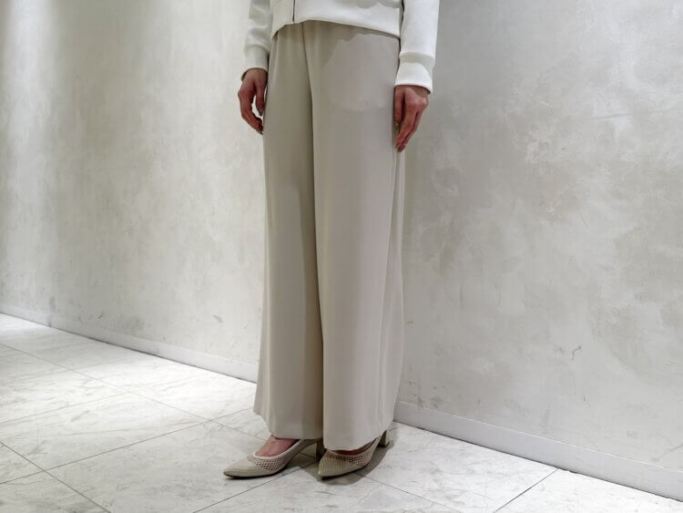 とろみのある滑らかな素材感が魅力の、通年活躍する定番ワイドパンツ。