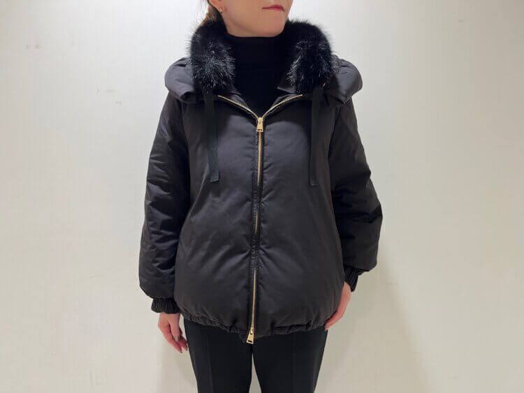 フード内側に施された同色のファーとゴールドジップが冬のレディスタイルに纏まるダウンコート◎