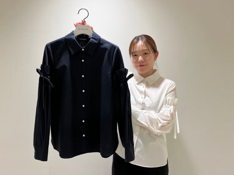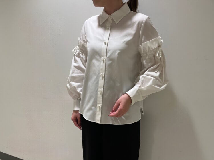 お袖に施された細めのリボンがトレンド感と女性らしさ漂ようデザインでありながらも、