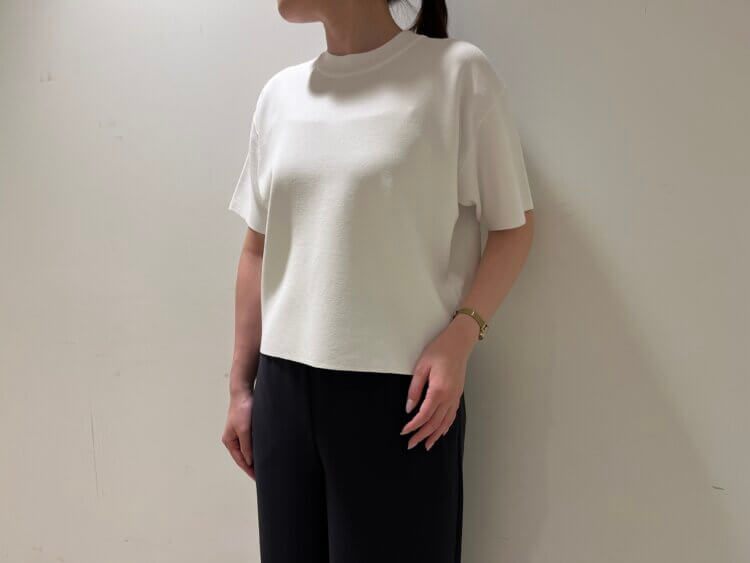 上品な表面感が魅力のミラノリブ素材で、適度なハリ感ながら