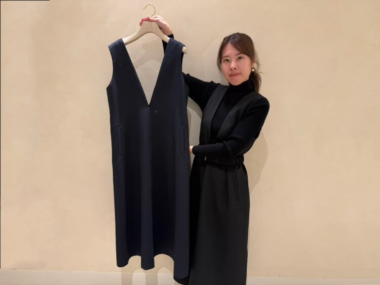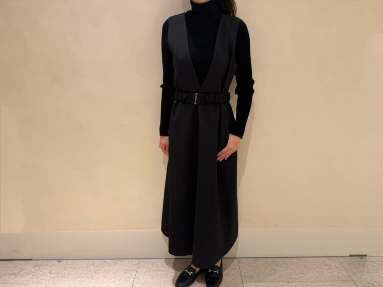 深いVネックがモードな印象を引き立てるジャンパースカート。
