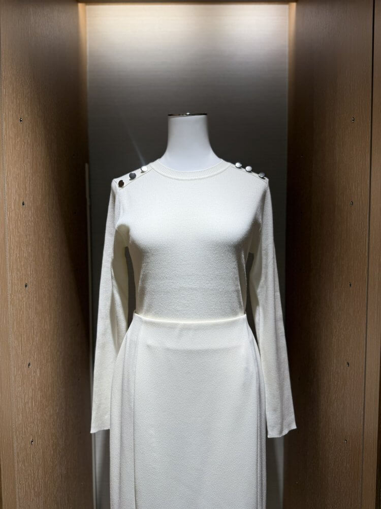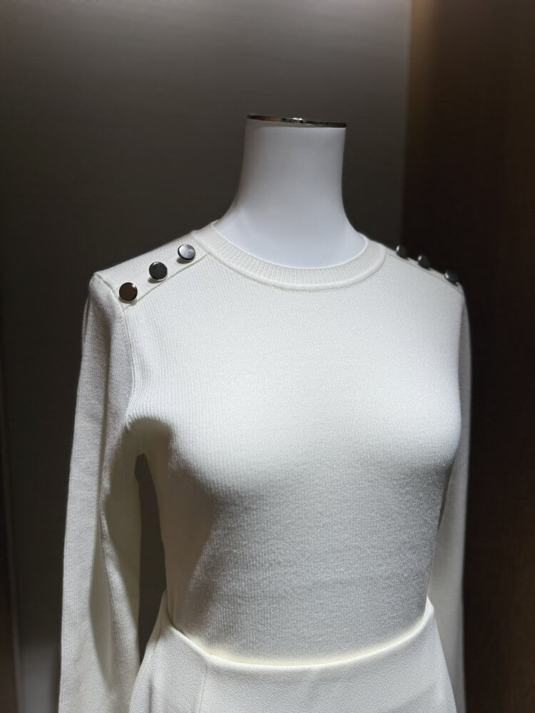 メタルボタンがさりげないアクセントとなり、シンプルな中にも洗練された華やぎを与えてくれます。