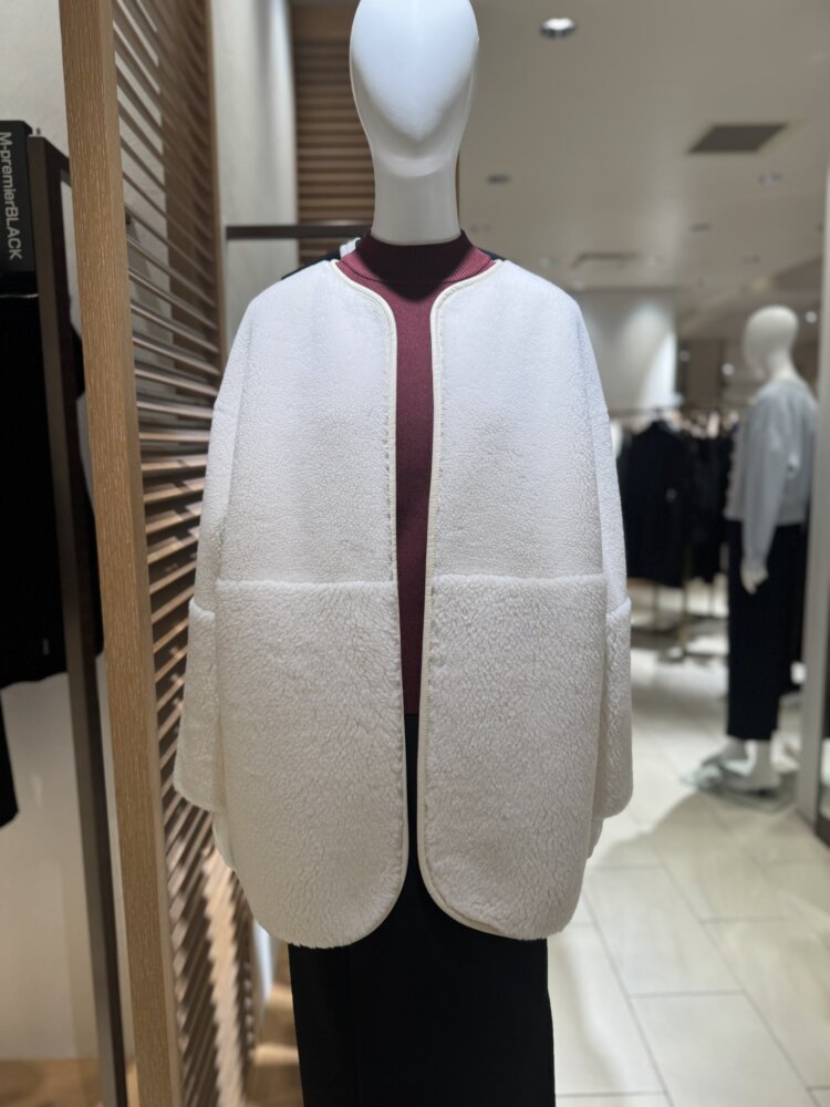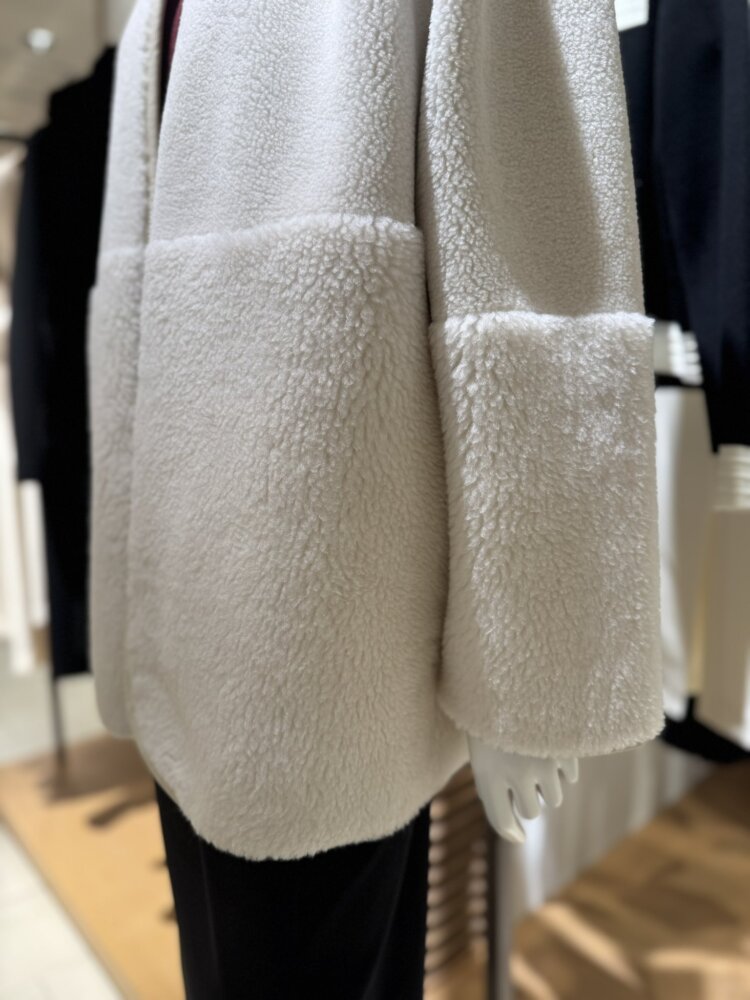 シンプルなスタイルに羽織るだけで、こなれ感のあるエレガントスタイルを作れるミドル丈のボアジャケット。