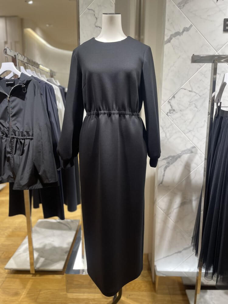 ウエストのギャザーが程よい立体感を生み出す、シンプルなブラックワンピース。