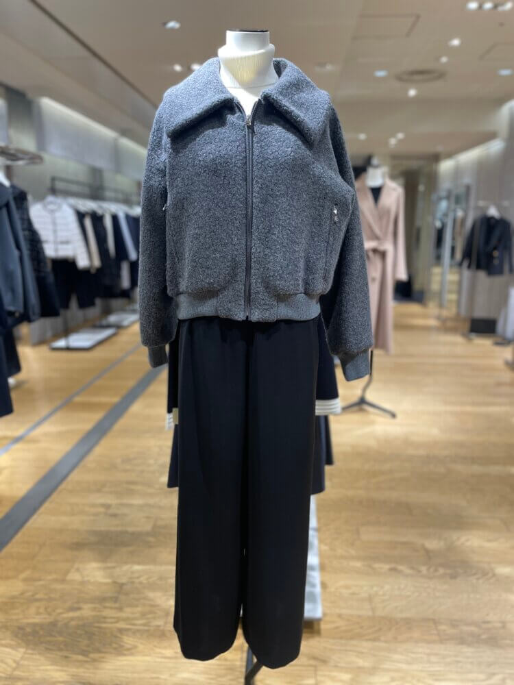 ふんわりとしたグレーのボアブルゾンに、着心地抜群のワイドパンツを合わせたコーデ。