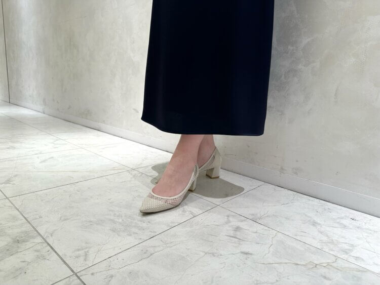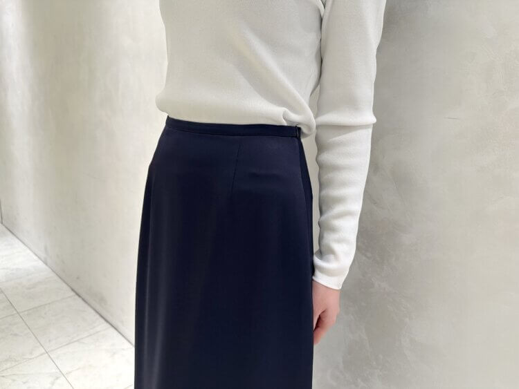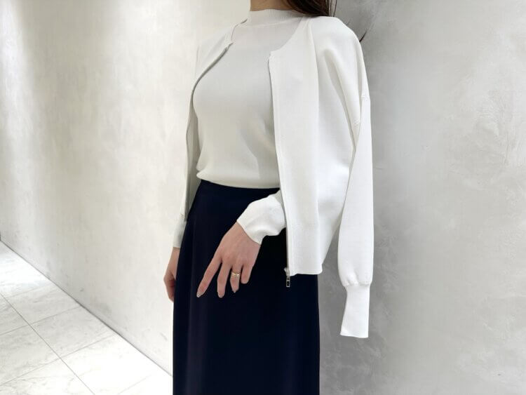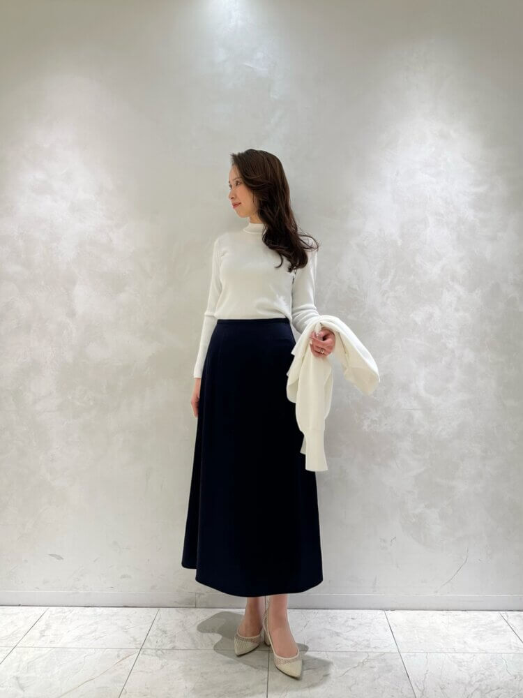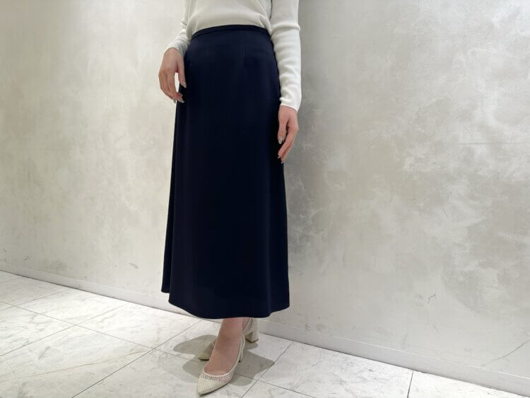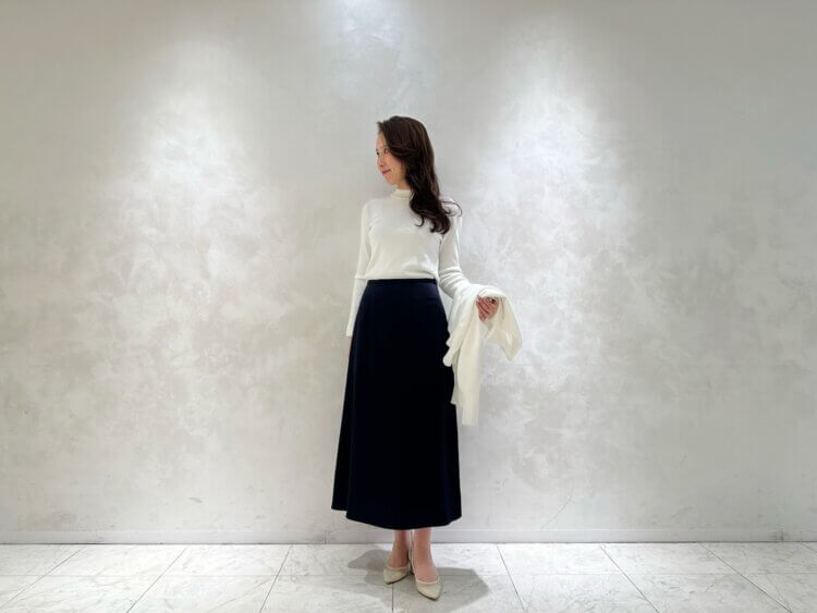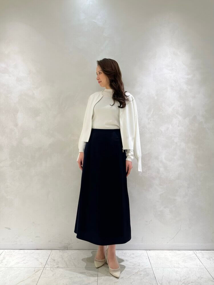 ボトムには落ち感のあるフレアスカートを合わせ、縦のラインを意識。柔らかな揺れと控えめな光沢が、配色のクリーンさに女性らしいニュアンスを加え、全体を甘さ控えめにまとめています。