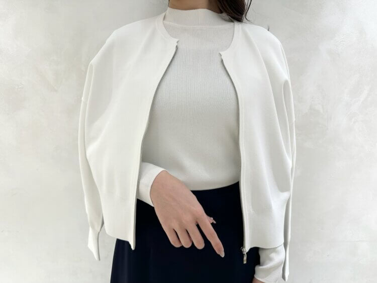 滑らかな質感のニットを主役に、コンパクトなシルエットと軽やかなレイヤードで奥行きを持たせたコーディネート。ハイネックのラインが顔まわりをすっきりと見せ、肩掛けしたニットカーディガンが程よい抜け感を添えます。