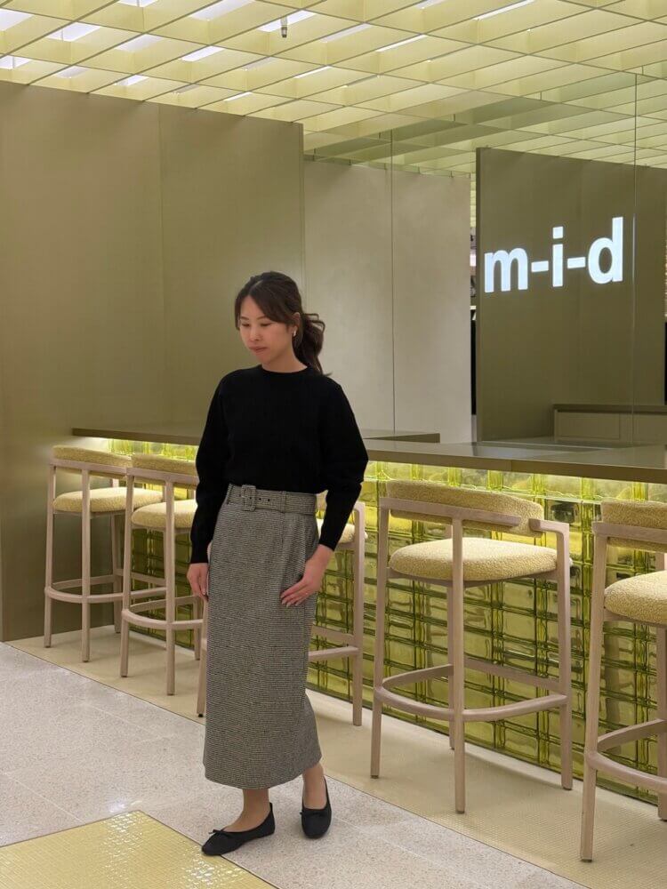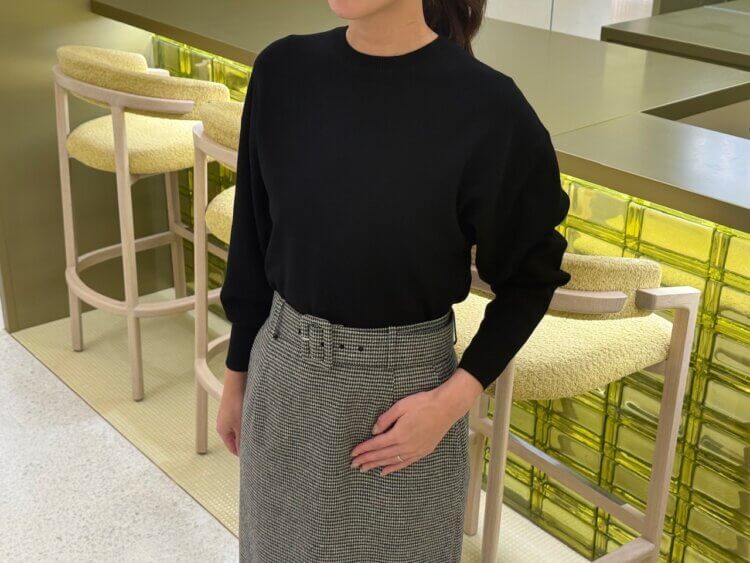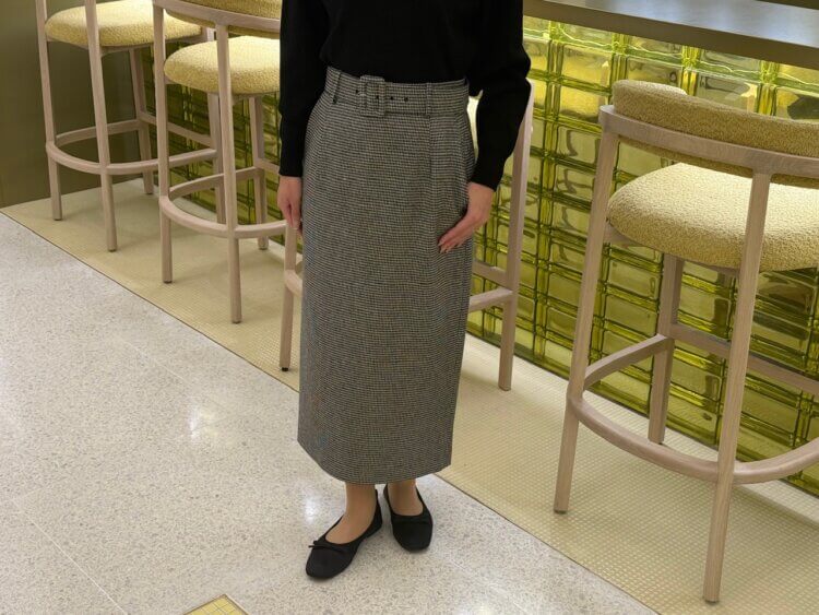 シックなブラックニットに、ガンクラブチェックのタイトスカートを合わせた上品なスタイル。