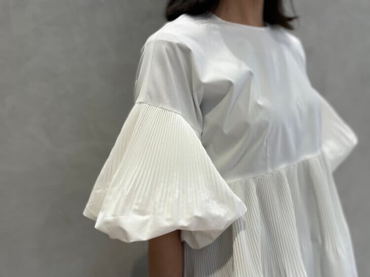 立体感のあるアコーディオンプリーツが印象的で、動くたびにふんわりと揺れるシルエットが女性らしい華やかさを演出してくれます。