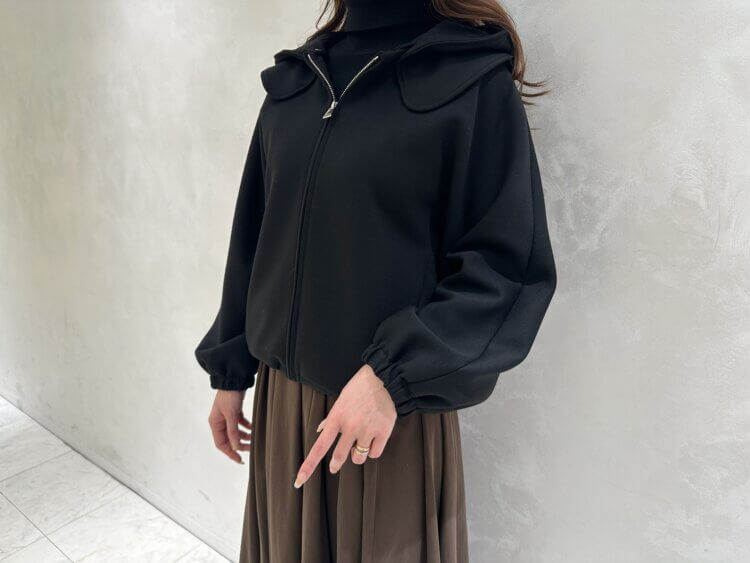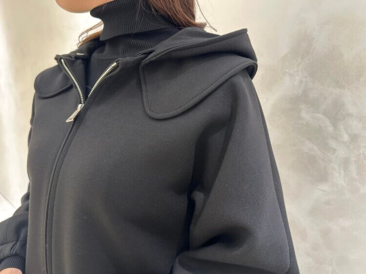 フードは取り外し可能で、付ければモードに、外せばクリーンな印象に◎裾のドローコードでシルエット調整ができ、着こなしにさりげない変化を加えてくれます。