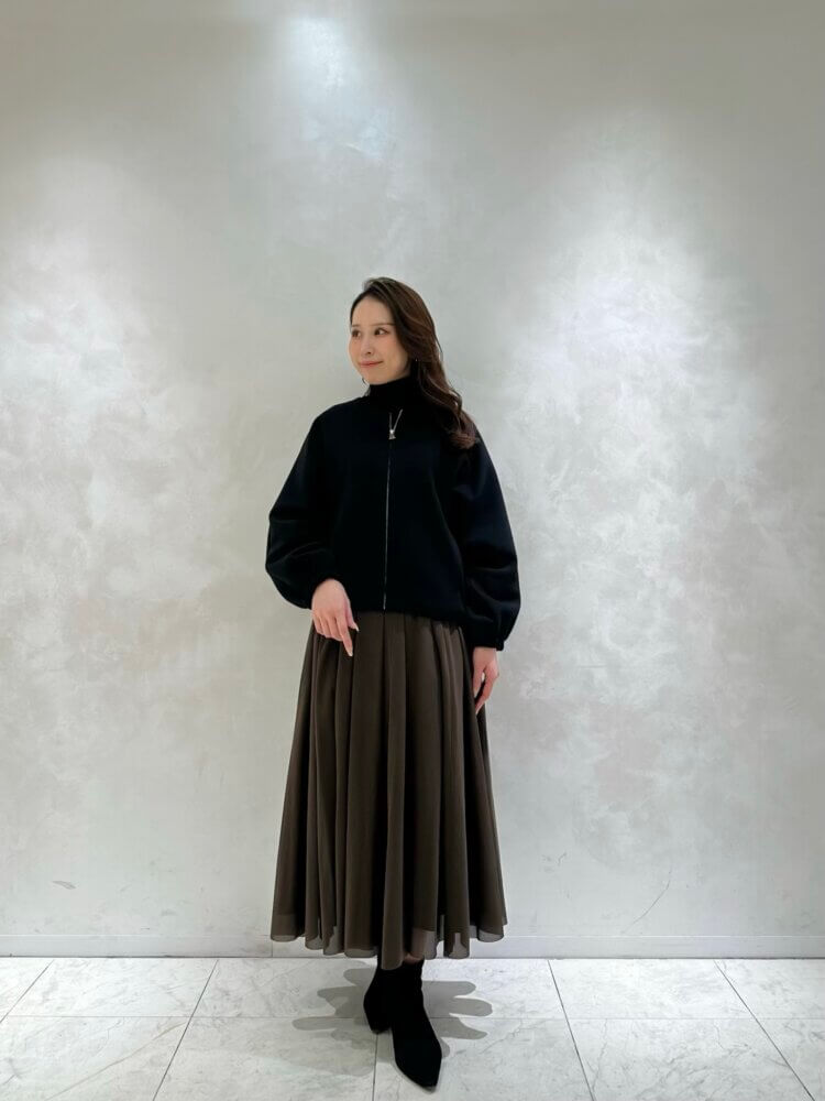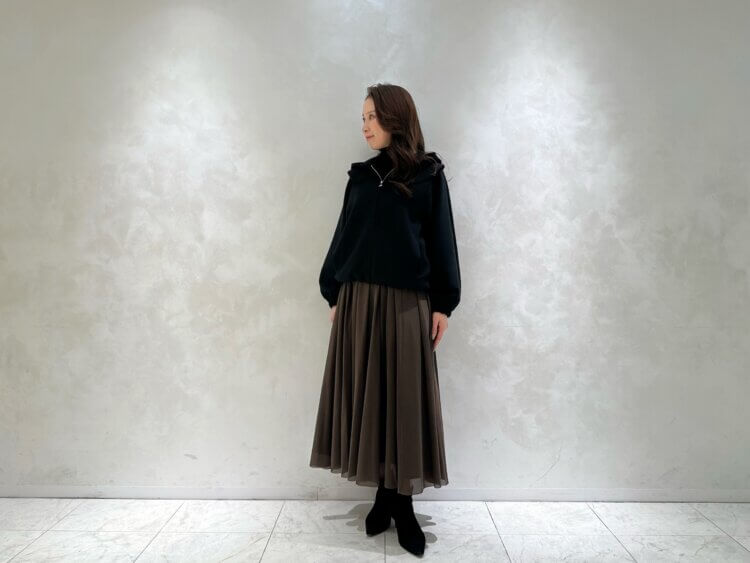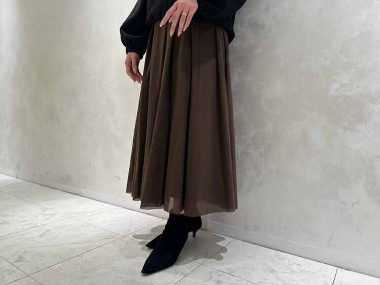ボトムには、シアー感のあるギャザースカートを。 ウエストまわりを美しく見せてくれるベルトラインと、ふんわり軽やかな素材感が特徴です。ロング丈でも重く見えず、ダークトーンのワンカラーコーディネートに程よい抜け感と奥行きをプラス。バックウエストはゴム仕様で、快適な着心地も叶えてくれます。