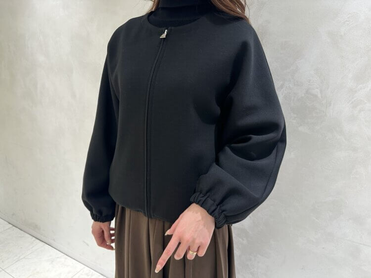 ウールブレンドのダンボールニット素材を使用したジップジャケットは、程よいハリ感と軽やかな着心地が魅力。