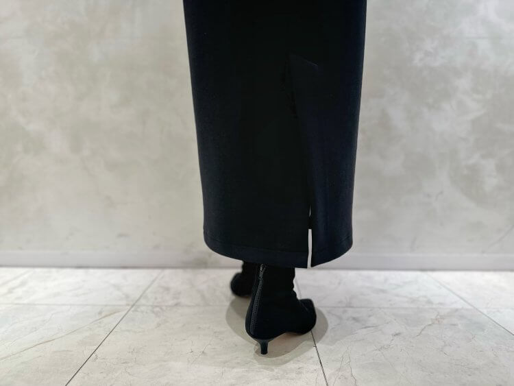 程よい厚みでボディラインを拾わず、快適な着心地と美しさを両立◎ バックスタイルにはベンツスリットが施され、足捌きの良さと抜け感を演出。ミニマルなデザインながら、アクセサリーや足元の合わせ次第で表情を変えられる、頼れる一着です。