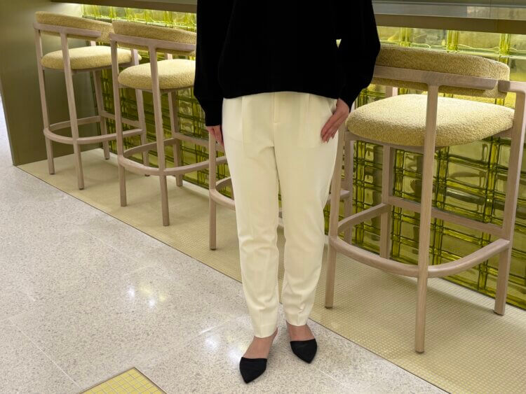 ボトムスには、ホワイトのテーパードパンツを合わせて軽やかさをプラス。センタープレスが縦のラインを強調し、脚をまっすぐ美しく見せてくれるのも嬉しいポイントです。ダブルクロス素材ならではのハリと伸縮性で、きちんと感がありながらもストレスフリーな履き心地を叶えます。
