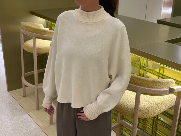 ホワイトニットと落ち着いたトーンのワイドパンツを合わせた冬にぴったりの柔らかく上品なコーディネートのご紹介。