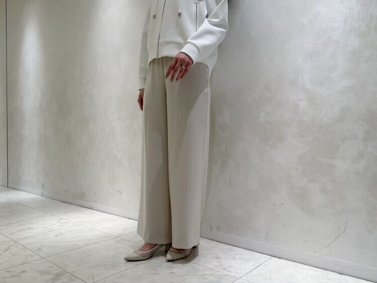 合わせたワイドパンツは、とろみのある滑らかな風合いと上品な見え感が特徴。深めの股上とゆとりのあるシルエットが自然なスタイルアップを叶えつつ、ボディラインを拾わない安心感のある穿き心地に。ウエストゴム仕様と優れた伸縮性で、快適さも兼ね備えています。
