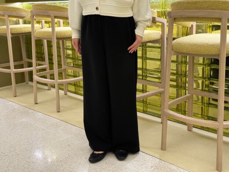 ボトムスには、上品な光沢感が美しいダブルクロス素材のワイドパンツをセレクトし、リラックス感ときちんと感を両立させました。深めの股上とゆったりとしたシルエットが身体のラインを拾わず、歩くたびに揺れるドレープが洗練された雰囲気を醸し出します。