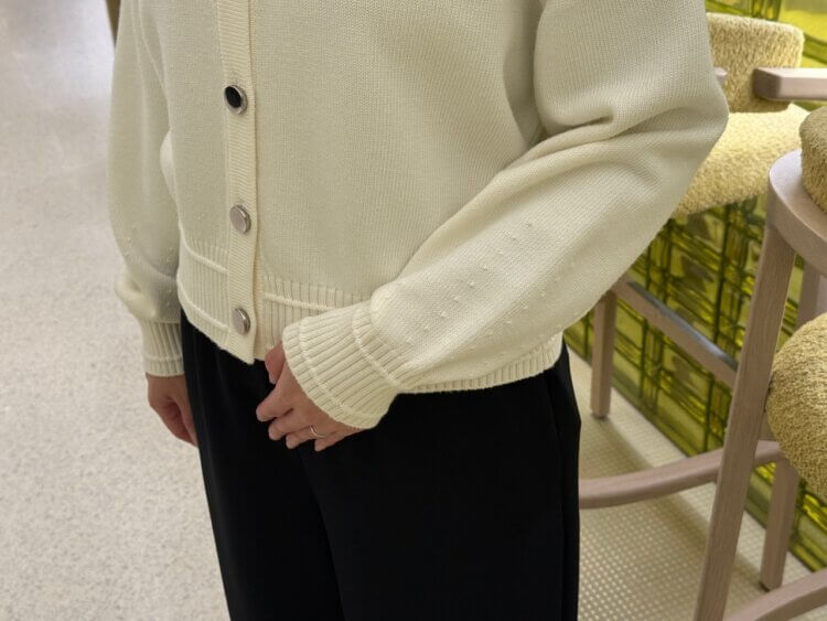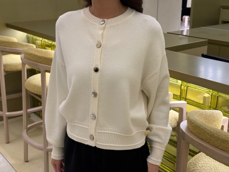 柔らかな膨らみのあるニットは肌当たりが良く、軽やかでありながらも上品な表情を併せ持つため、デイリーに取り入れやすい一枚です。フロントのメタルボタンがさりげないアクセントとなり、シンプルな中にもモードな華やぎをプラスしてくれます。ほんのり丸みのあるシルエットのカーディガンは、羽織るだけで自然と女性らしい柔らかさを演出。
