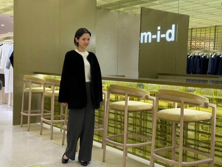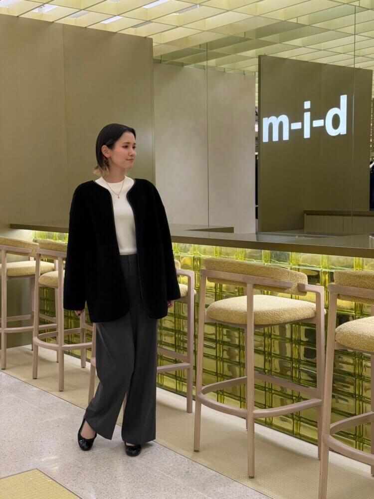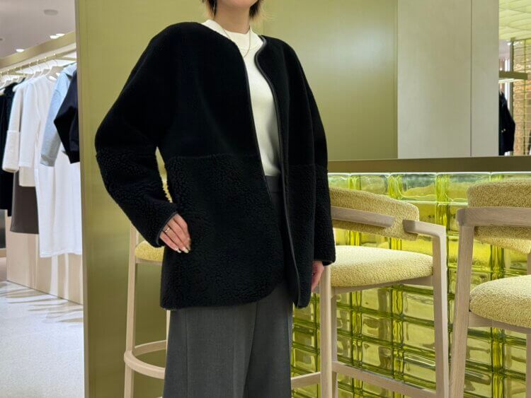スタイリングに暖かみのある柔らかな表情を添えるミドル丈のボアコート。