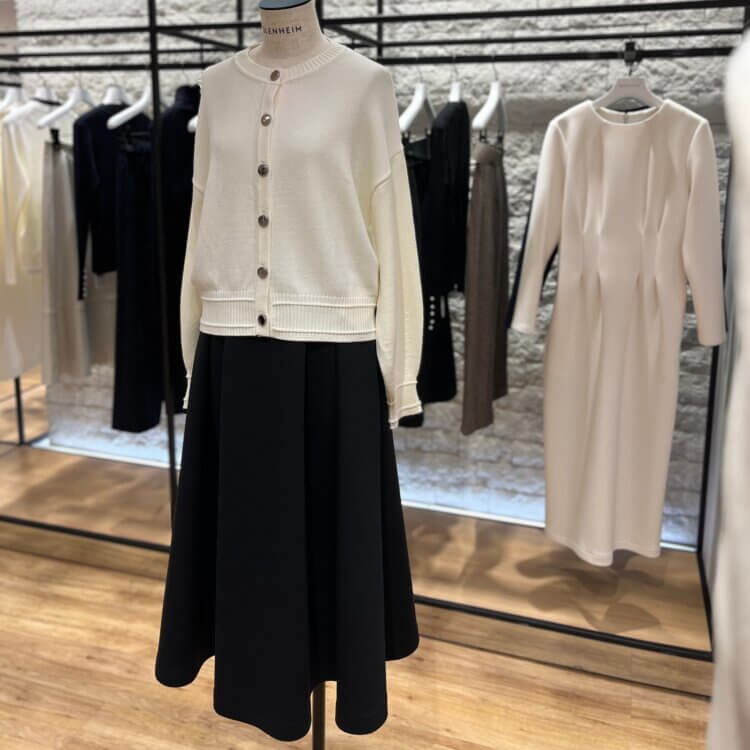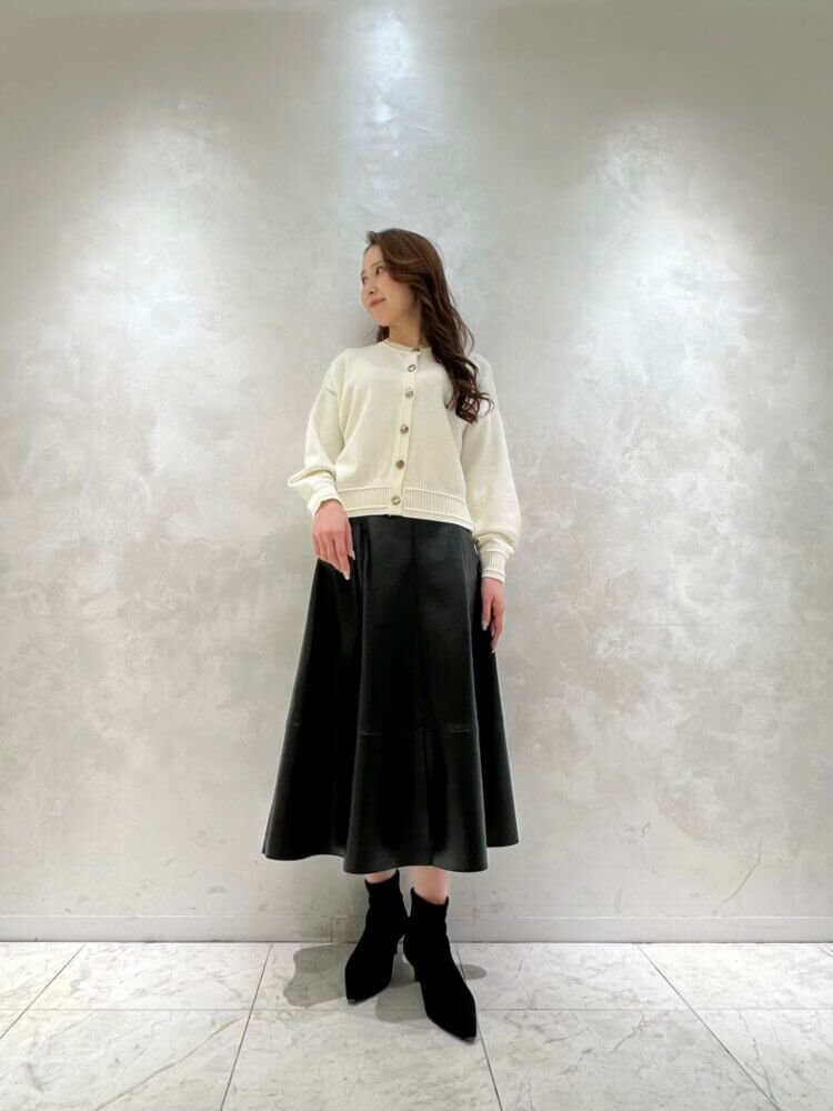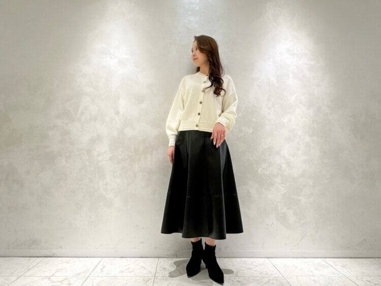 異素材のコントラストを効かせることで、シンプルながら奥行きのある着こなしが完成。動くたびに揺れるフレアラインが、さりげない華やぎを添えてくれます。 白の柔らかさに黒を効かせて引き締めることで、甘さを抑えた大人のモノトーンスタイルに。冬らしさと女性らしさをバランス良く楽しめるコーディネートです。