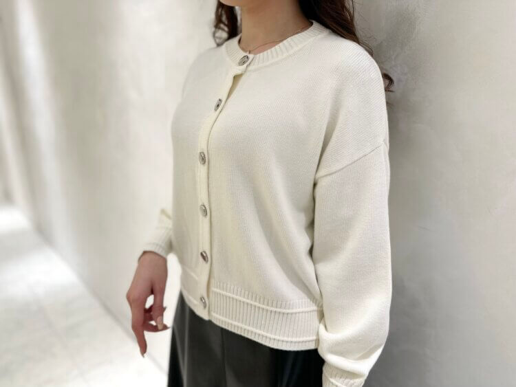 トップスは、レーヨンベースのしなやかなニット素材で仕立てた中厚手のカーディガン。