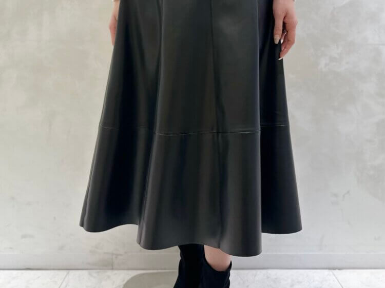 ハードになりすぎないレザー調素材が程よいモード感を演出し、切り替えから広がるフレアシルエットでエレガントな印象に◎
