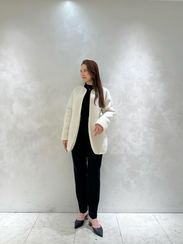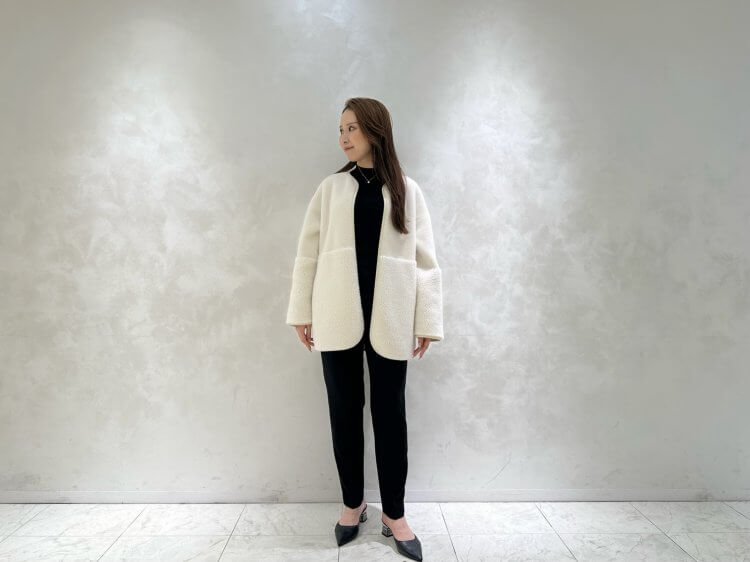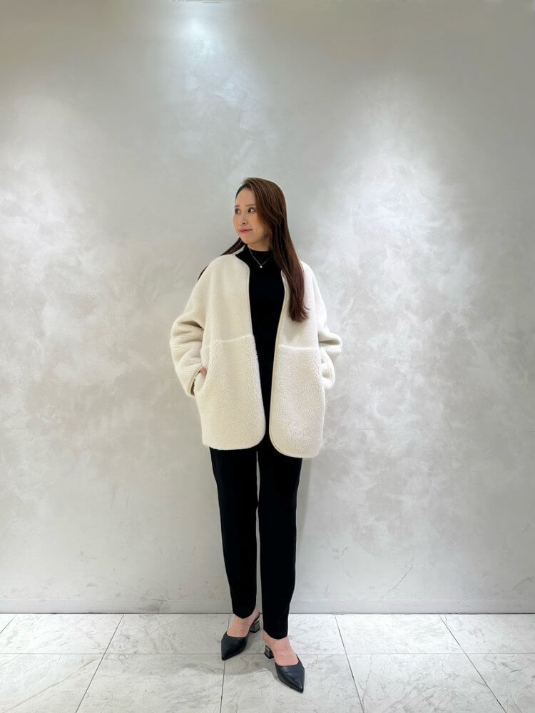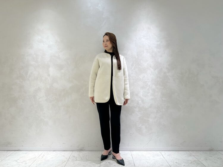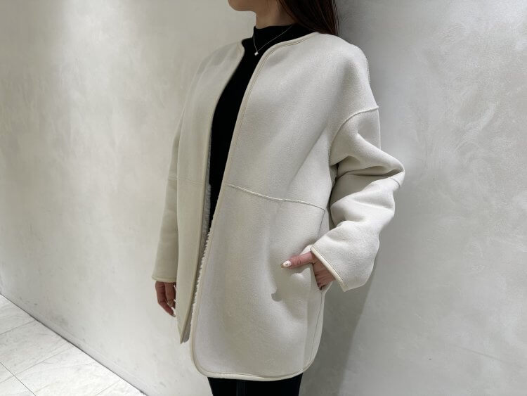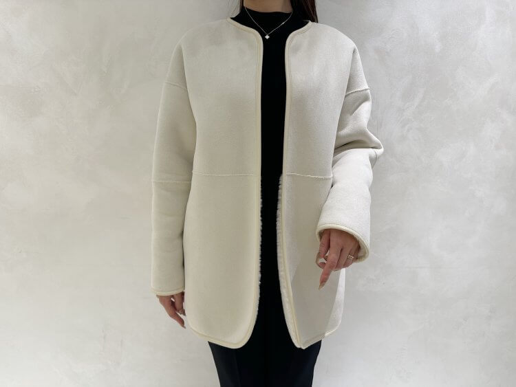 ふんわり柔らかなボア面は暖かみのあるカジュアルな印象に、フェイクスエード面は滑らかな質感がモードで上質なムードを演出します。どちらを表にしても、ノーカラーデザインとレザーパイピングがシャープなアクセントとなり、洗練された印象に◎