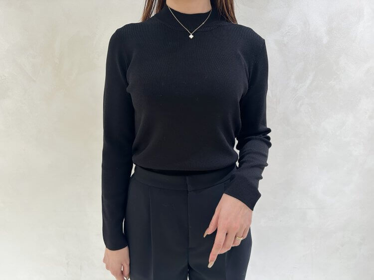 インナーには、上品な光沢感と滑らかな肌触りが魅力のハイゲージブラックニットをチョイス。ボディラインを拾いすぎない程よいフィット感で、きちんと感と女性らしさを両立します。ボトムはすっきりとしたテーパードパンツで縦ラインを強調し、全体を上品にまとめました。