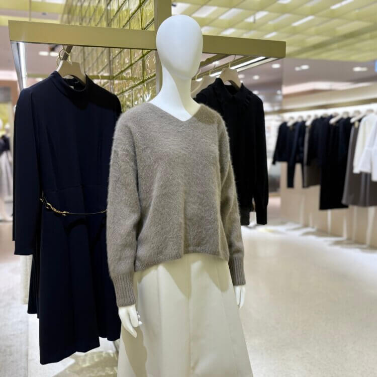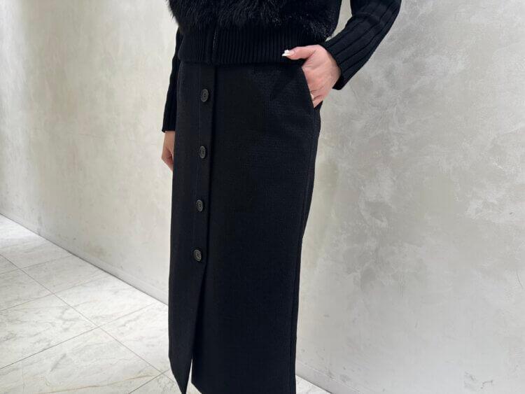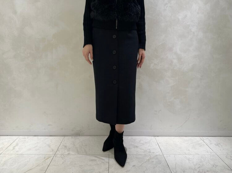 合わせたのは、シックなツイードの風合いがコーディネートにクラシカルな深みを添えるタイトスカート。