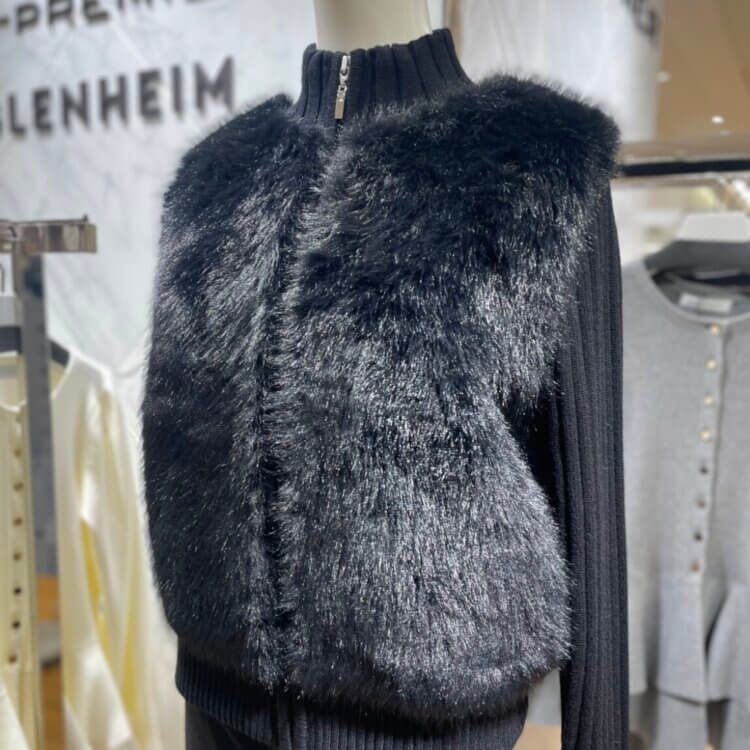 艶感のあるフェイクファーがラグジュアリーな印象を添え、存在感を放ちます。袖と背面はリブ編みで切り替え、すっきりとしたシルエットと動きやすさを両立。絶妙な丈感でバランスが取りやすく、今の時期にぴったりな軽アウターとして活躍◎