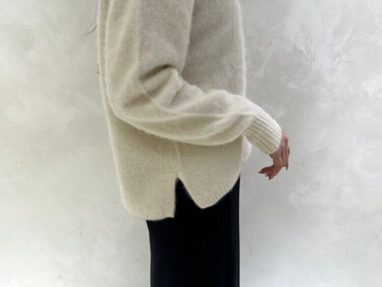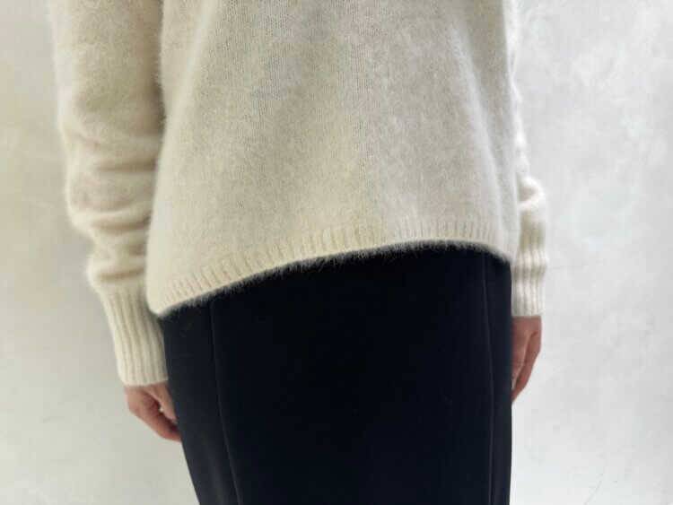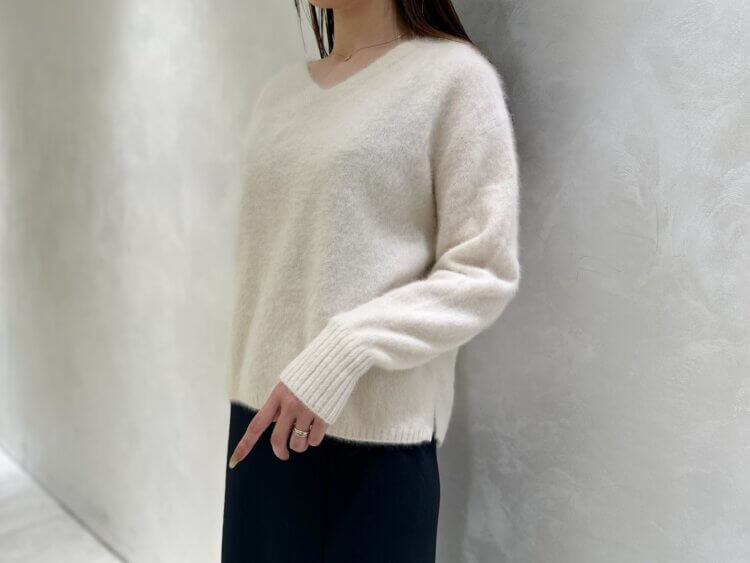 カシミヤブレンドのニットは、空気を含むような軽さと上質なタッチが魅力の一枚。