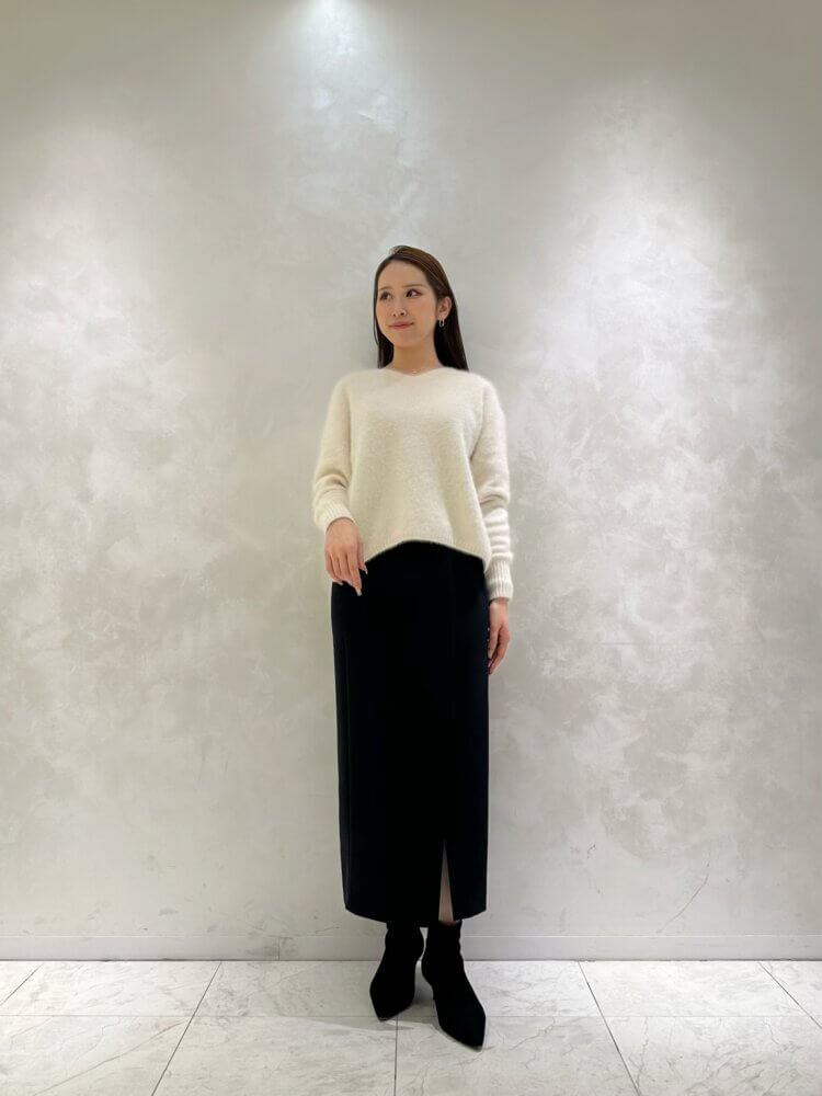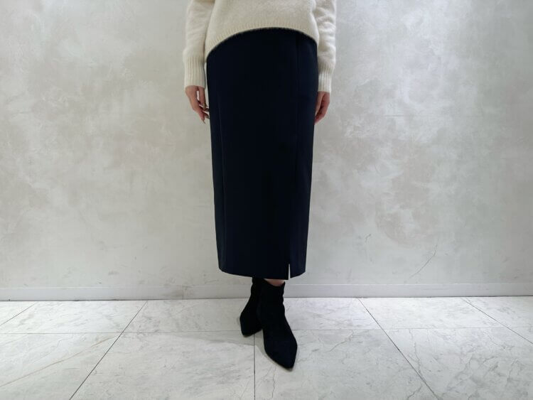 合わせたタイトスカートは、ほのかな光沢を纏うニットジョーゼット素材。まっすぐ落ちるラインにベンツスリットを加え、動きに合わせてわずかにニュアンスが生まれるモードなバランス。装飾を排したデザインだからこそ、素材とフォルムの美しさが際立ちます◎