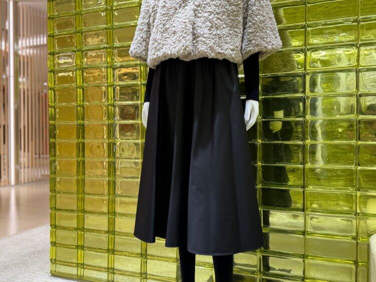 程良い光沢感と美しいフレアシルエットが魅力のフレアスカート。