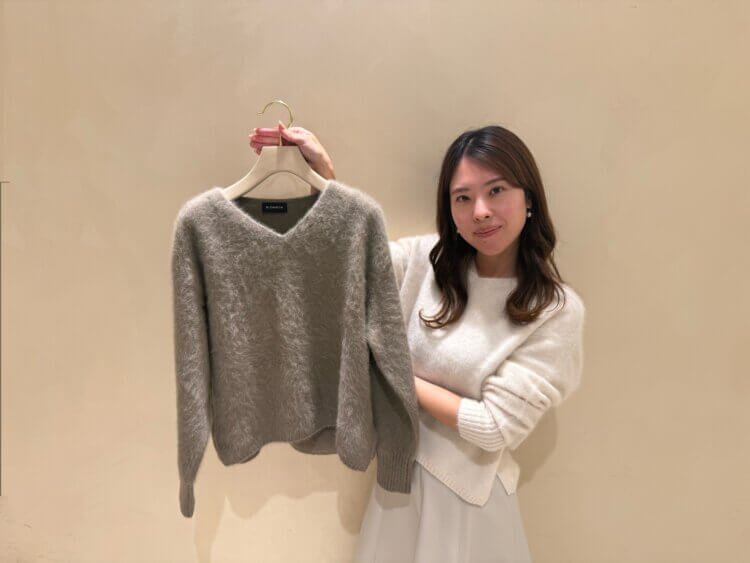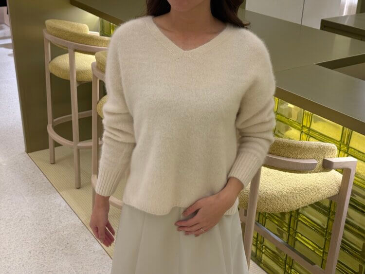 カシミヤブレンドのふんわりとした柔らかな風合いが、スカートスタイルにも優しいニュアンスを添えるニット。Vネックが顔周りをスッキリと見せ、上品な抜け感を演出します。コンパクトすぎないシルエットで、フレアやタイトシルエットにもバランスよくまとまる一枚です。