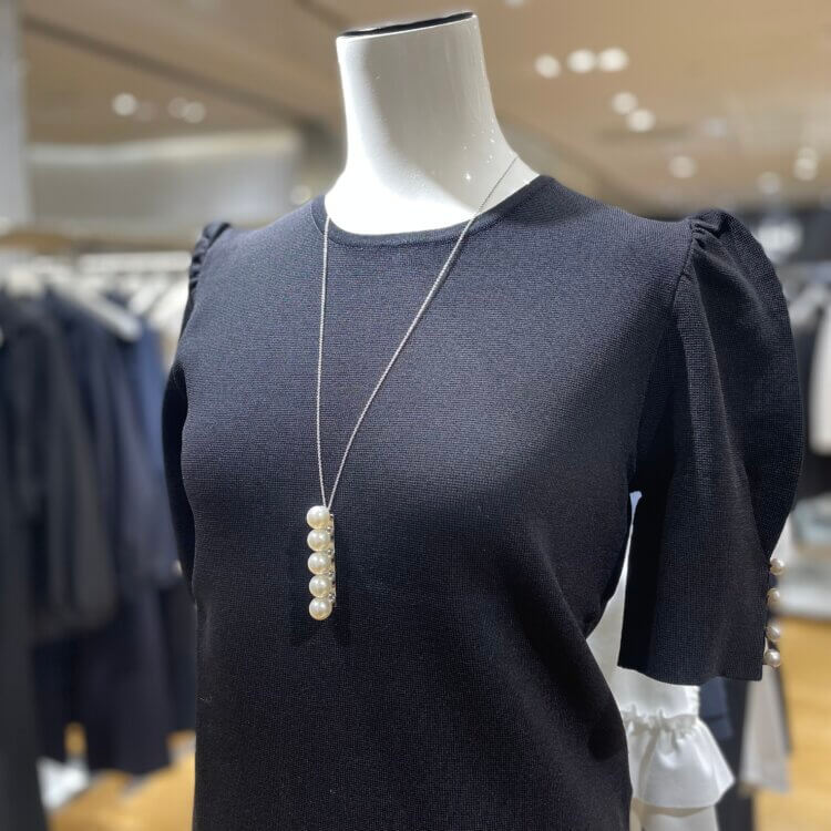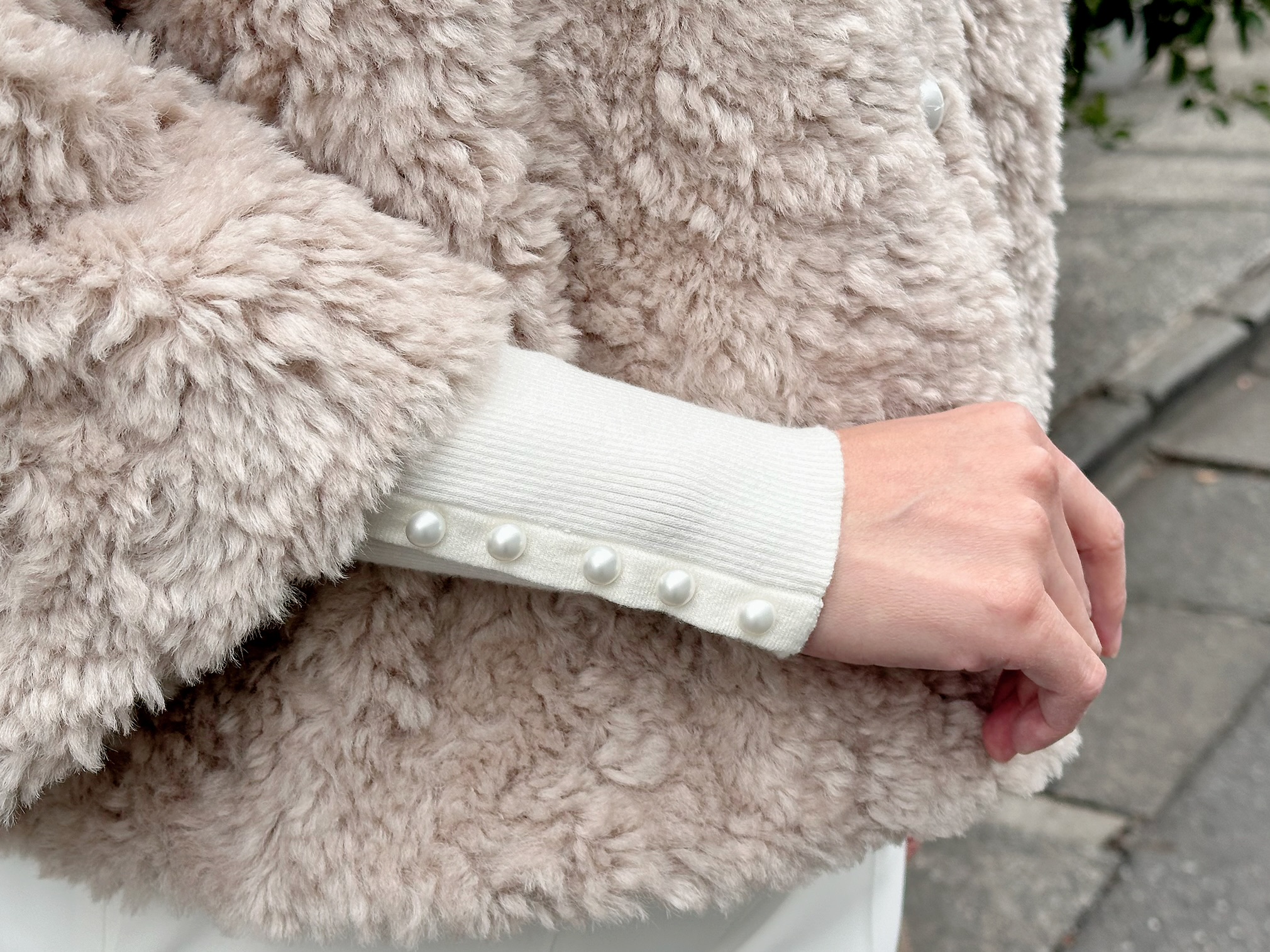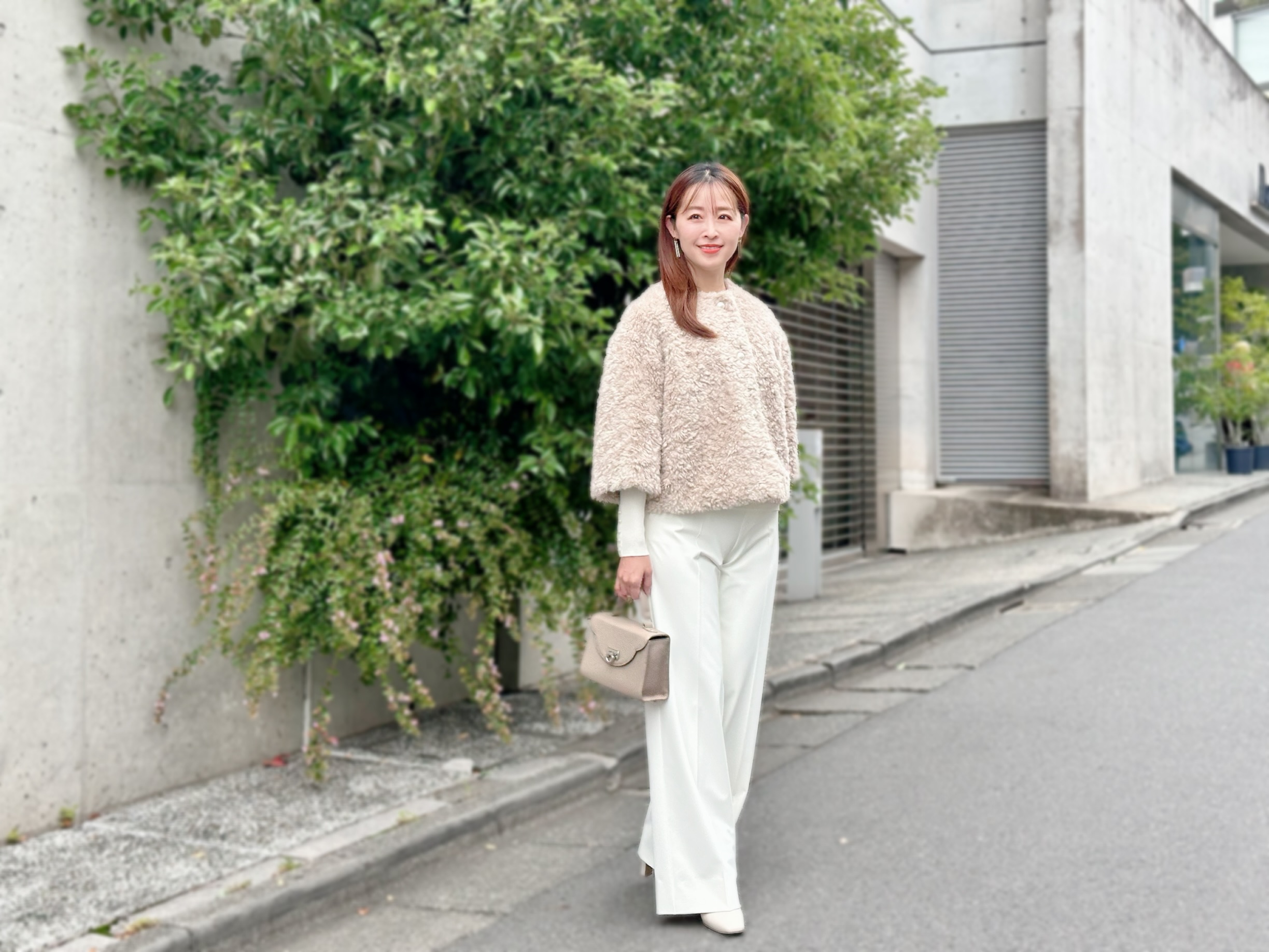 夜はこのままディナーへ。ふわふわのファーとパールのディテールがほどよい華やかさを添えてくれて、一日中気分良く過ごせるスタイルになりました。