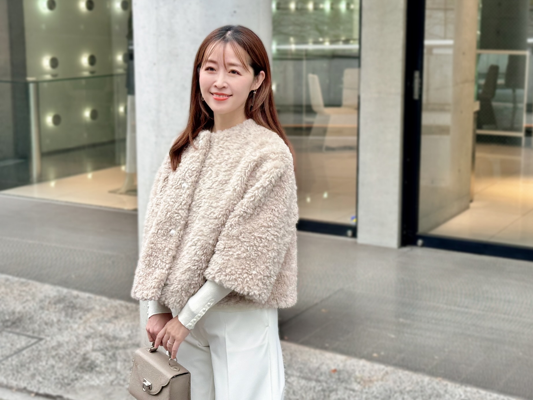 しかも午前中は雨がぱらついていたので、あたたかくて気分の上がる“ふわもこファーアウター”をチョイスしました。