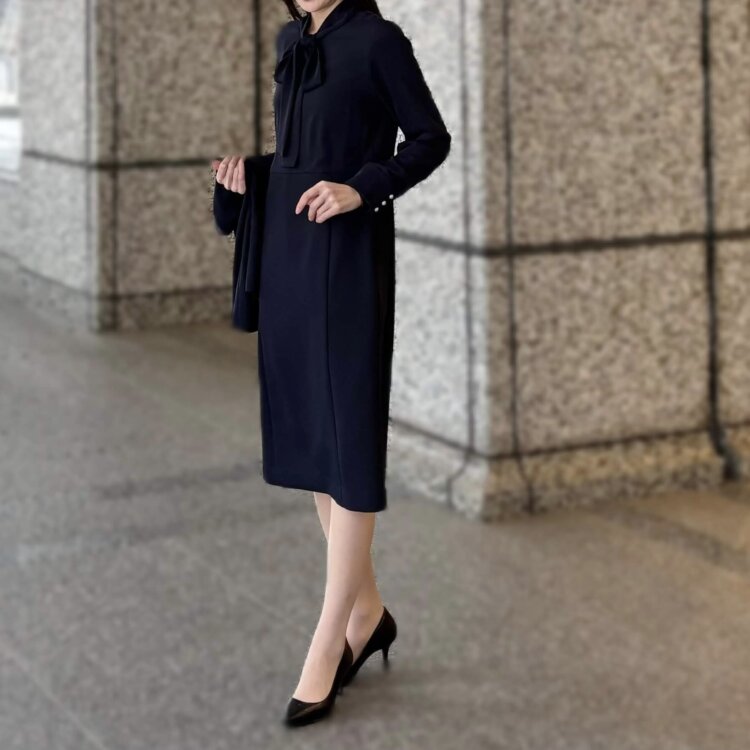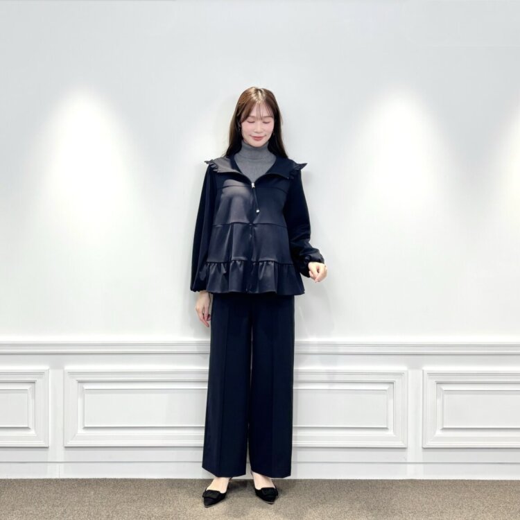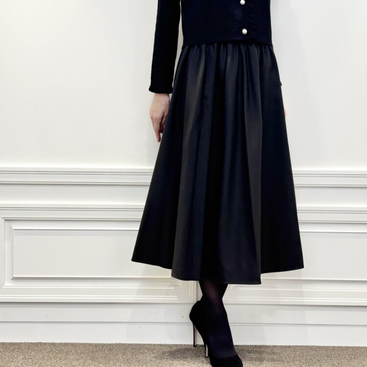 こちらのシャーリングワンピースはツヤのある素材が今年らしく、華やかさもあるのに着やすくてお気に入りです!